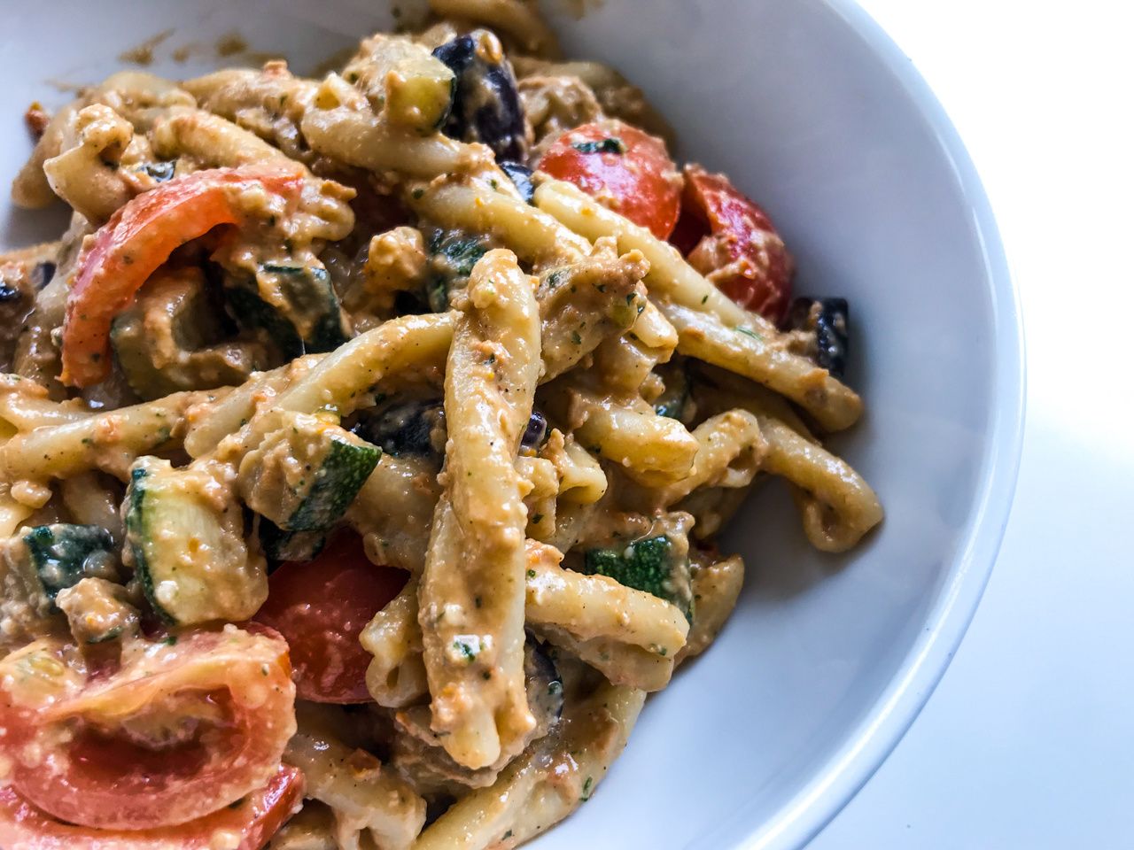 Make your own pesto for this red pesto pasta with roasted veggies – and while you're at it, maybe make some extra, it's SO good! Quick and easy to make this red pesto will make you never want to buy the pre-made kind again.