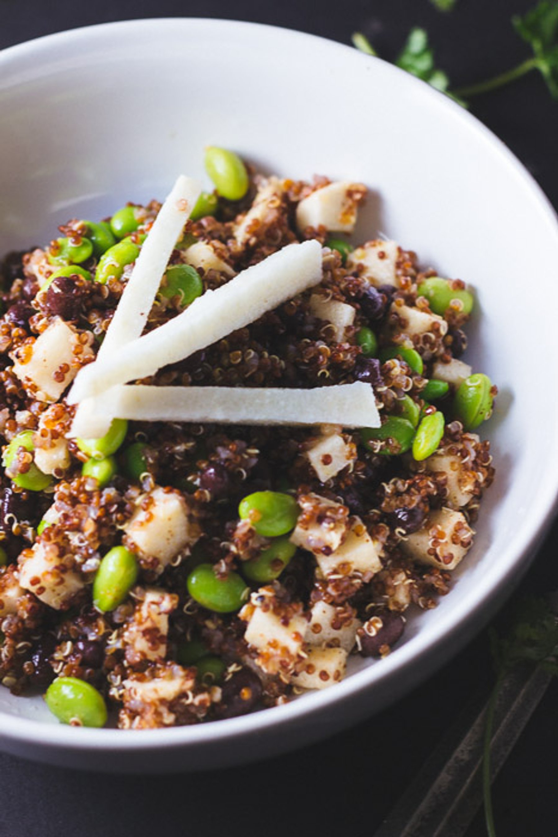 Cook 1 cup of quinoa according to package instructions ( I prefer to use chicken broth instead of water) then place in the fridge to chill for about 20 minutes). Meanwhile, rinse the edamame and black beans and set aside. Peel and dice the jicama. In a small bowl combine the ingredients for the vinaigrette and whisk until emulsified. Once the quinoa is cool, combine with the above ingredients and toss well.