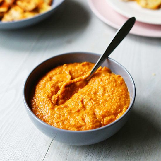 This red roasted bell pepper hummus dip goes really well with these spicy tortilla crisps. It is so easy to make.