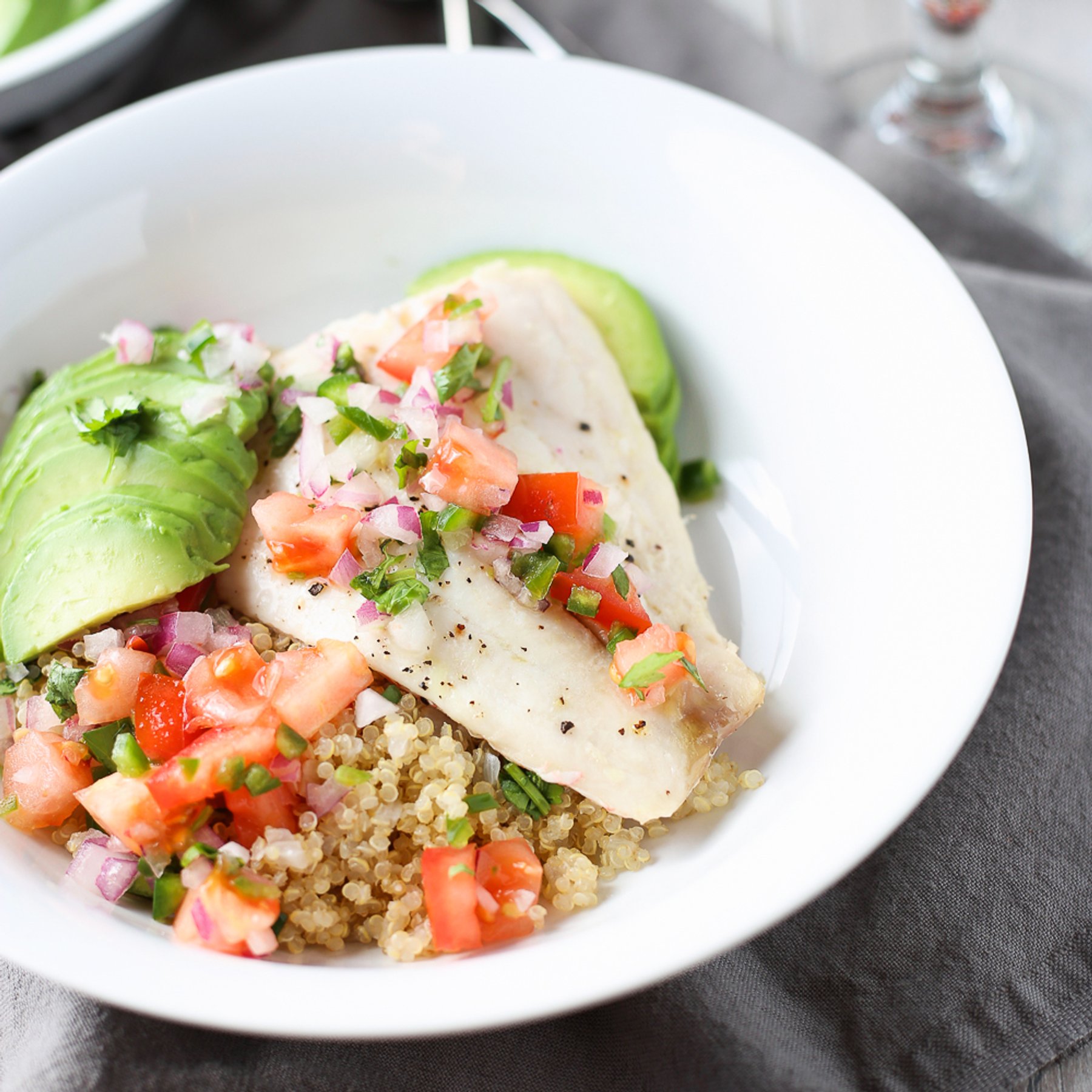 Red snapper seared and baked in a cast iron pan topped with an avocado, tomato, and jalapeño salsa all over quinoa. A simple and yet tasty meal. Oh, and healthy too!!