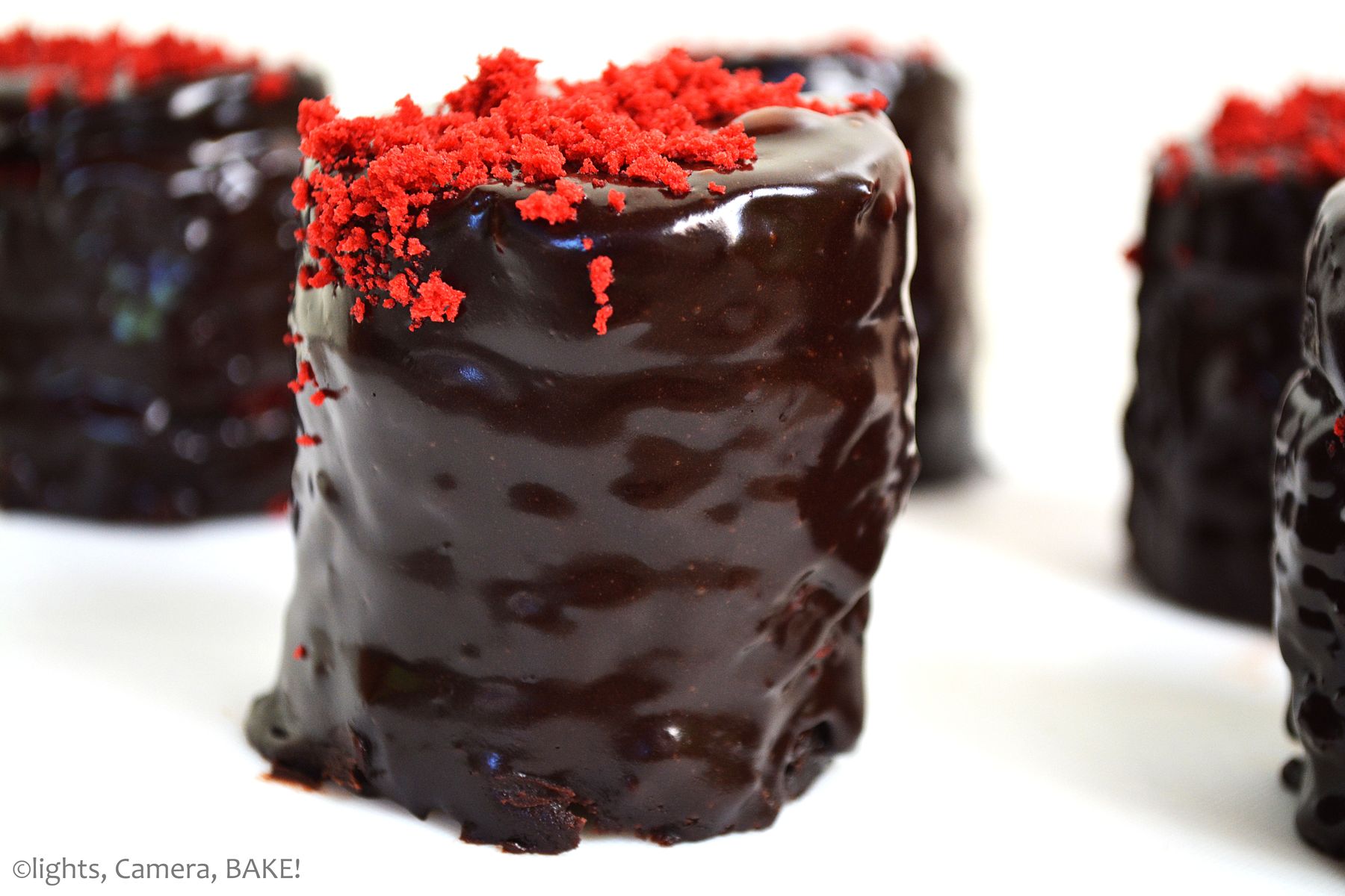 A decadent stack of fudgy brownie and red velvet cake, layered together and covered in a glossy chocolate ganache.