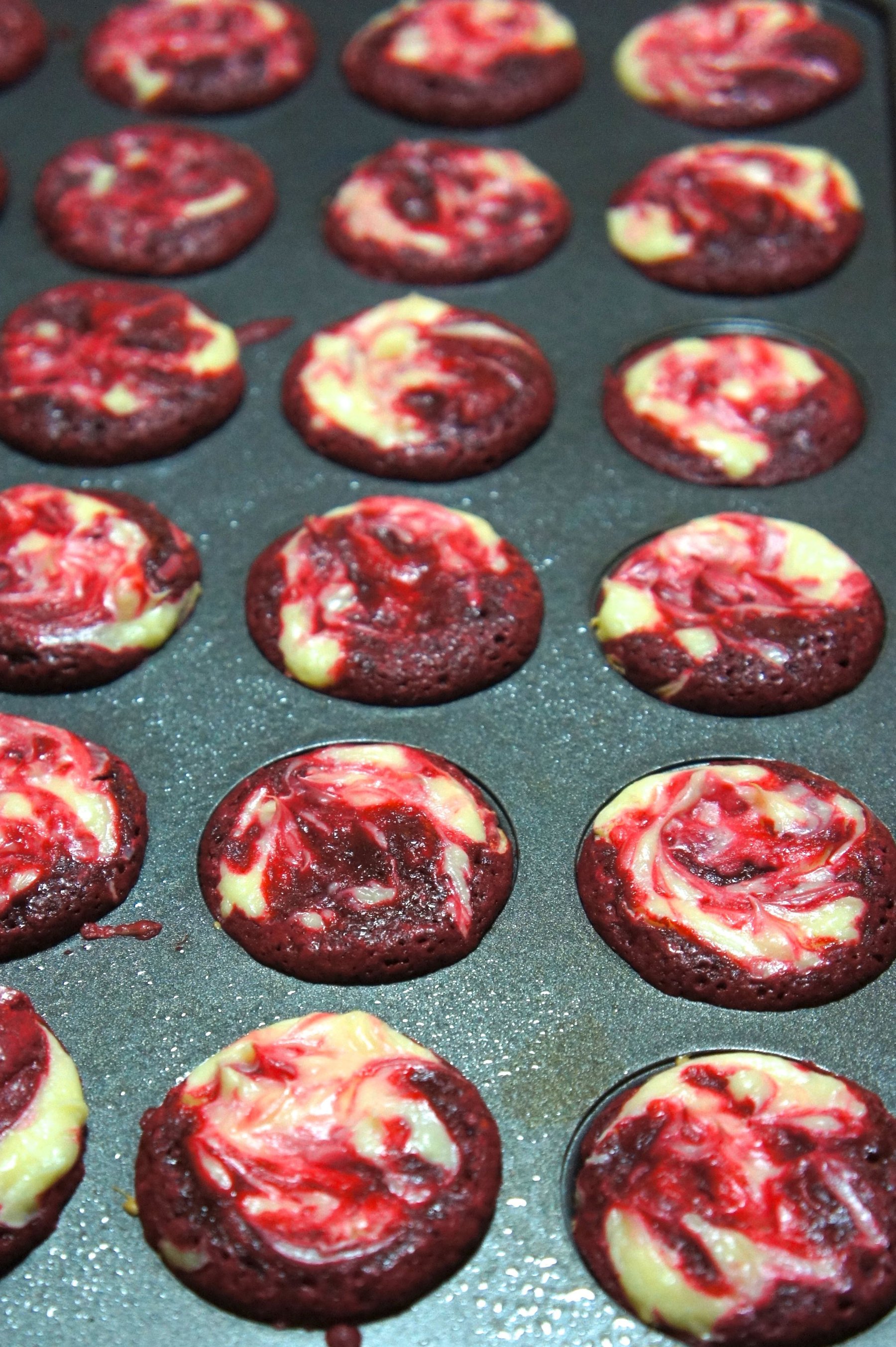Red velvet brownies with a cream cheese swirl made either in a 9x9 pan or mini versions made in a mini muffin tin.