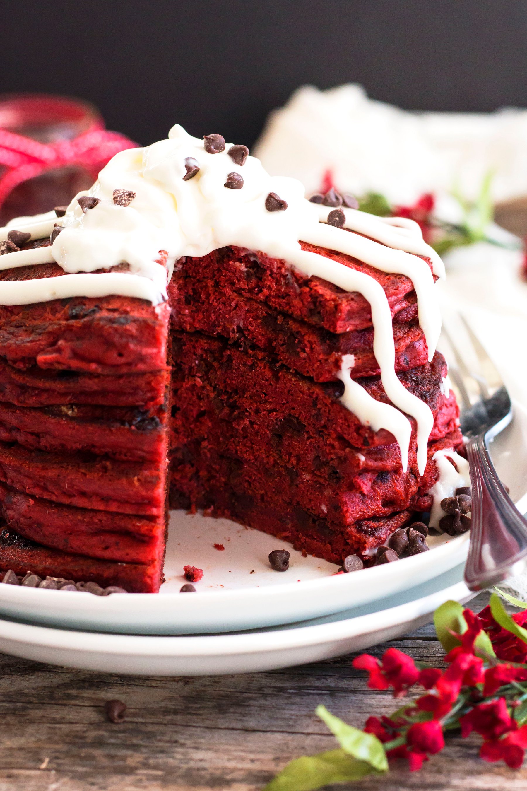 Rich and decadent red velvet pancakes are studded with mini chocolate chips. A quick breakfast treat, (made from Bisquick!) for your loved one on Valentine’s Day!