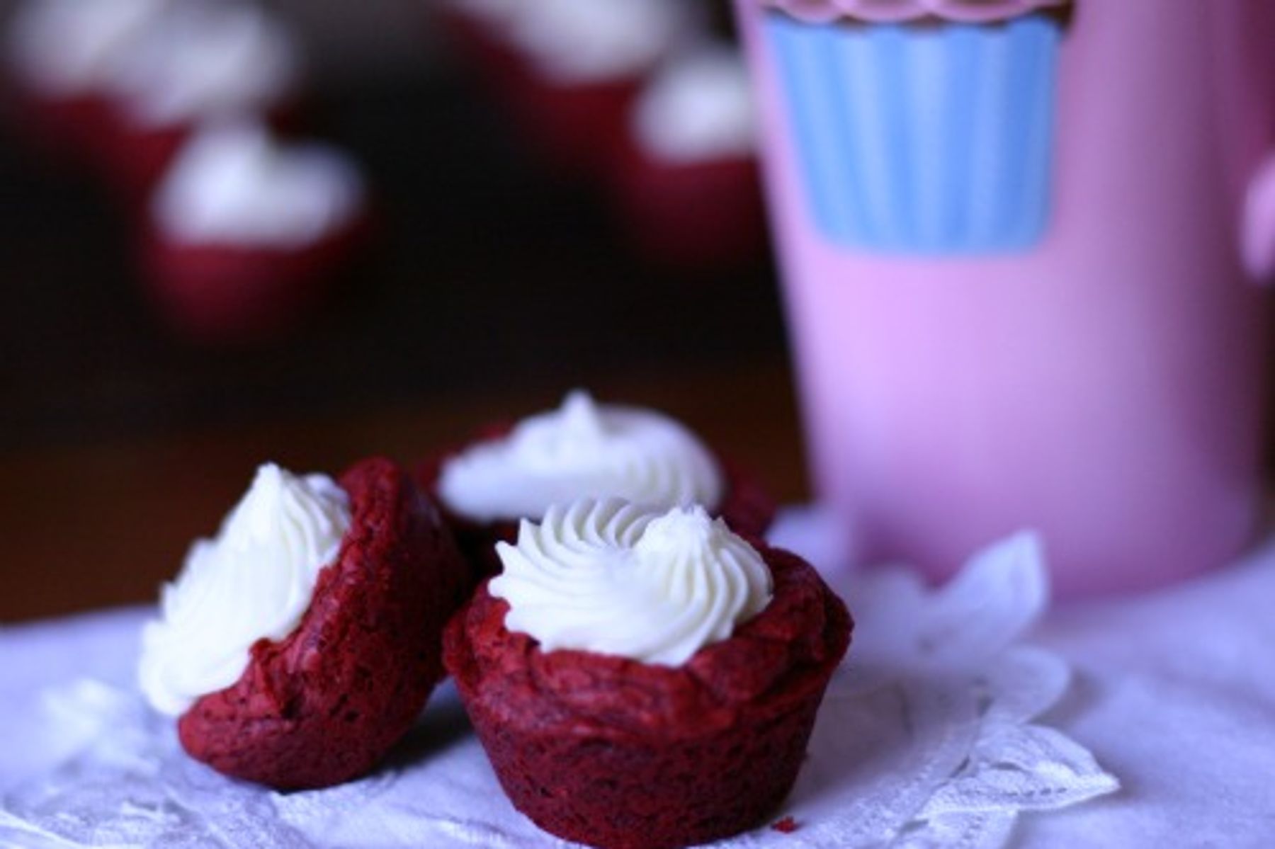 Red Velvet Cups filled with white chocolate and amaretto buttercream.