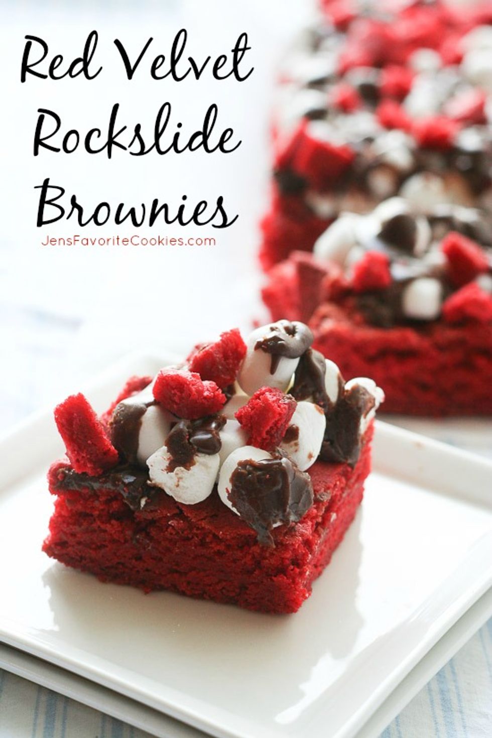 Rich red velvet brownies with a marshmallow chocolate "rockslide" topping.