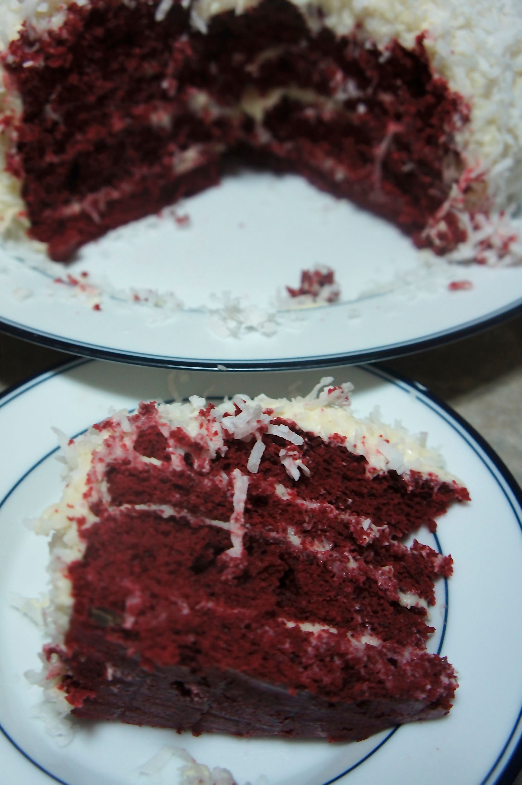 A delicious combination of red velvet cake, cream cheese and white chocolate frosting with coconut.