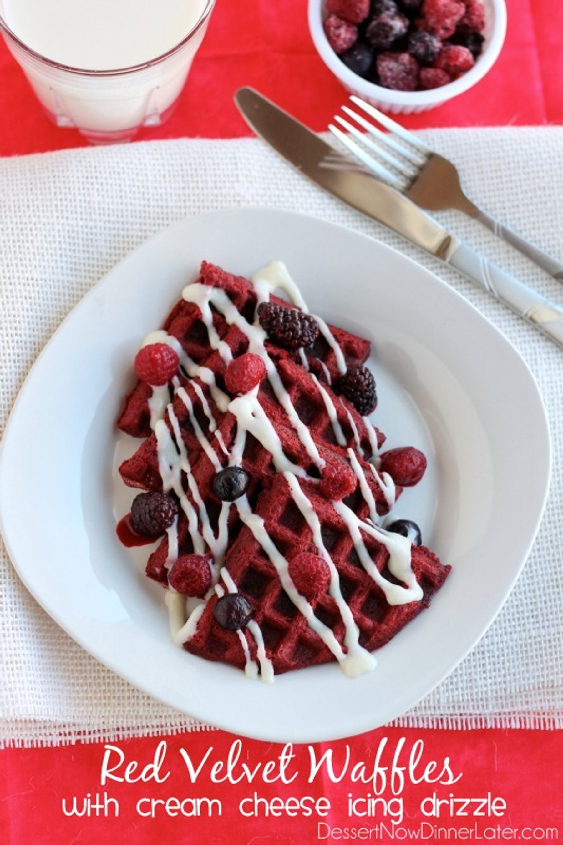 Red Velvet Waffles with Cream Cheese Icing Drizzle