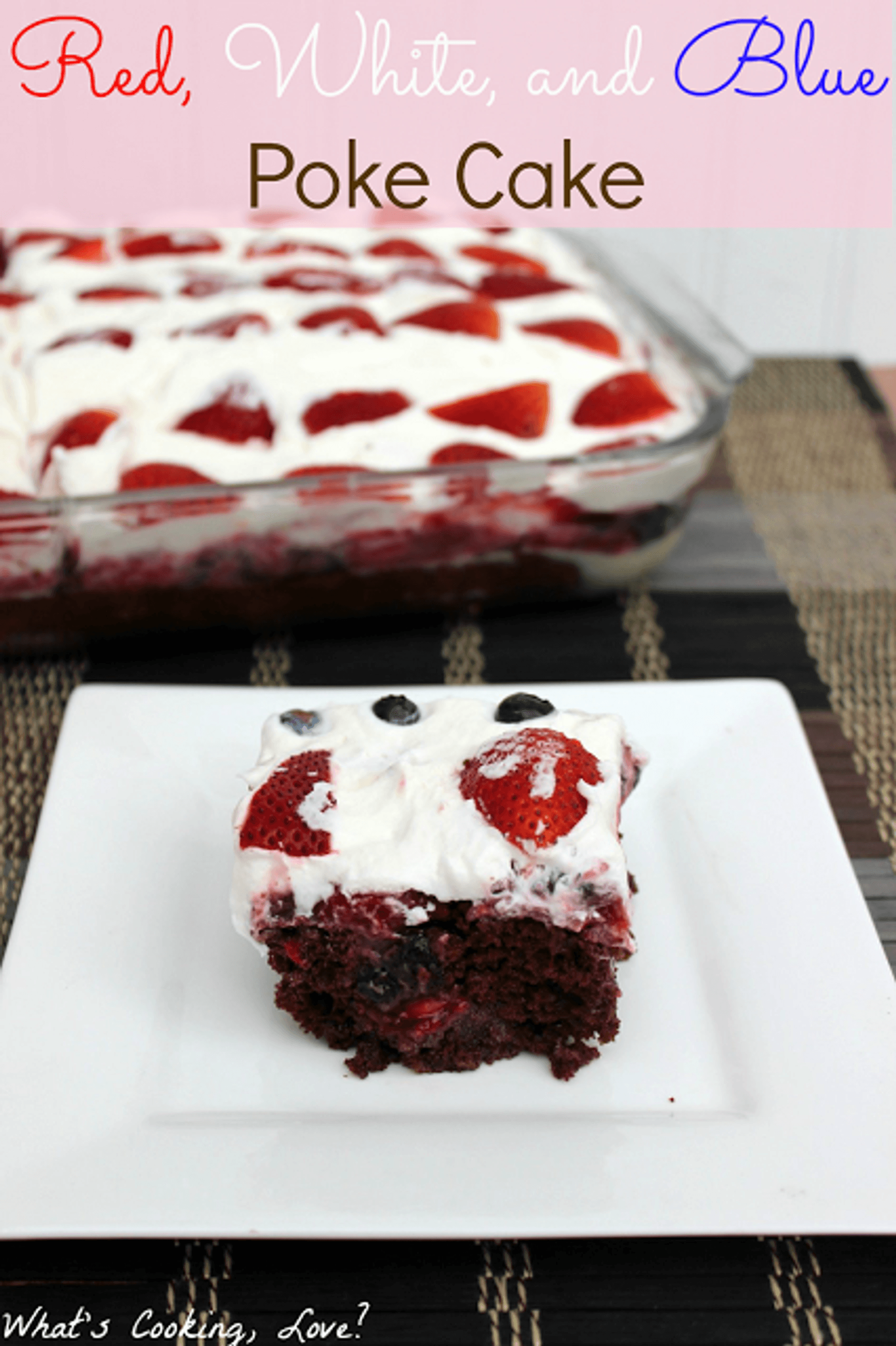 Red, White, and Blue Poke Cake. An easy poke cake made with strawberry and blueberry pie filling and topped with whipped cream