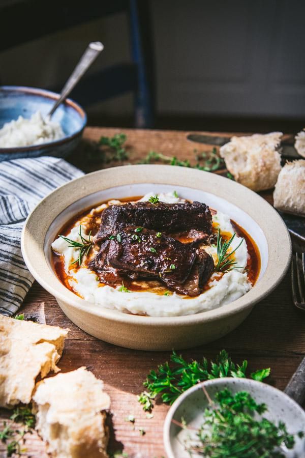 These red wine braised beef short ribs cook low and slow in a Dutch oven until they're tender, succulent, and full of rich flavor. Serve them over mashed potatoes with the red wine sauce and a side of roasted root vegetables, broccoli, or a crisp green salad. The classic dish is perfect for a cozy Sunday supper with family, and fancy enough for entertaining.