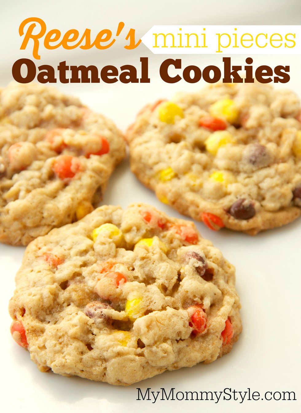 Chewy, sweet oatmeal cookies with mini Reese's pieces inside. These are my new favorite cookies!!