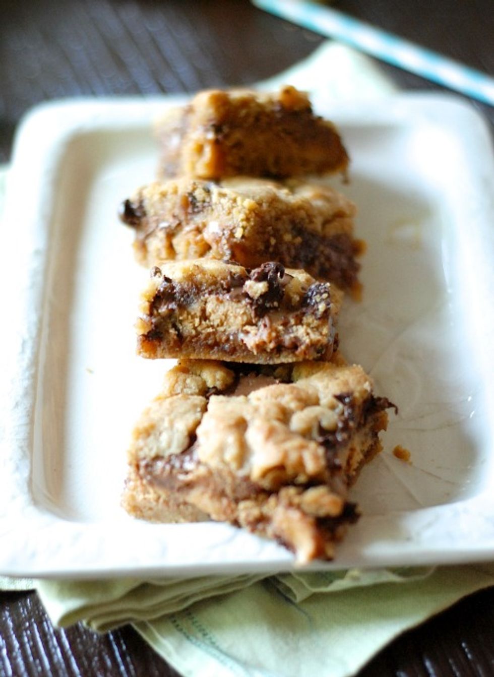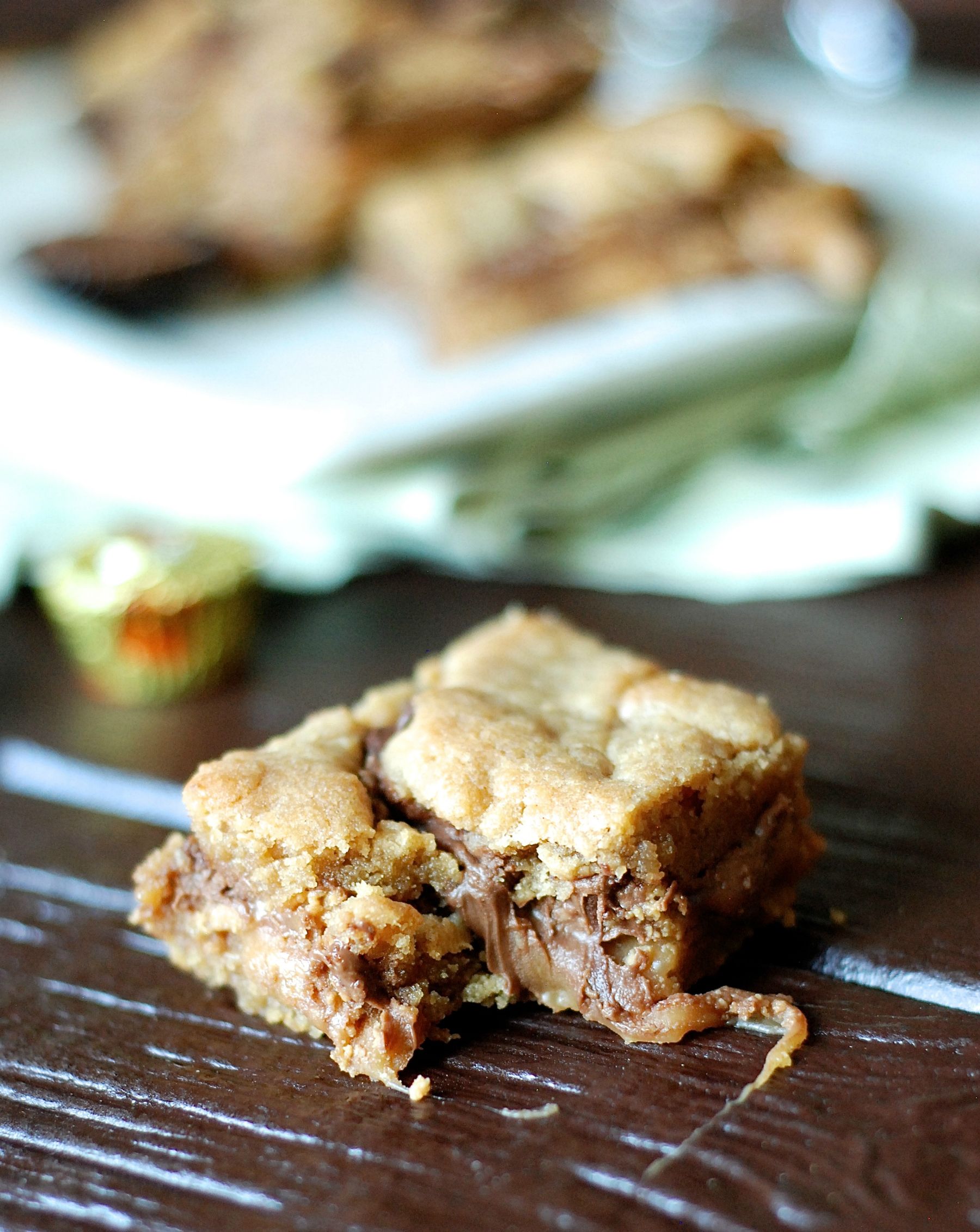 Rich and thick peanut butter bars with a lots of chopped Reese's Cups, chocolate chips and a layer of caramel.