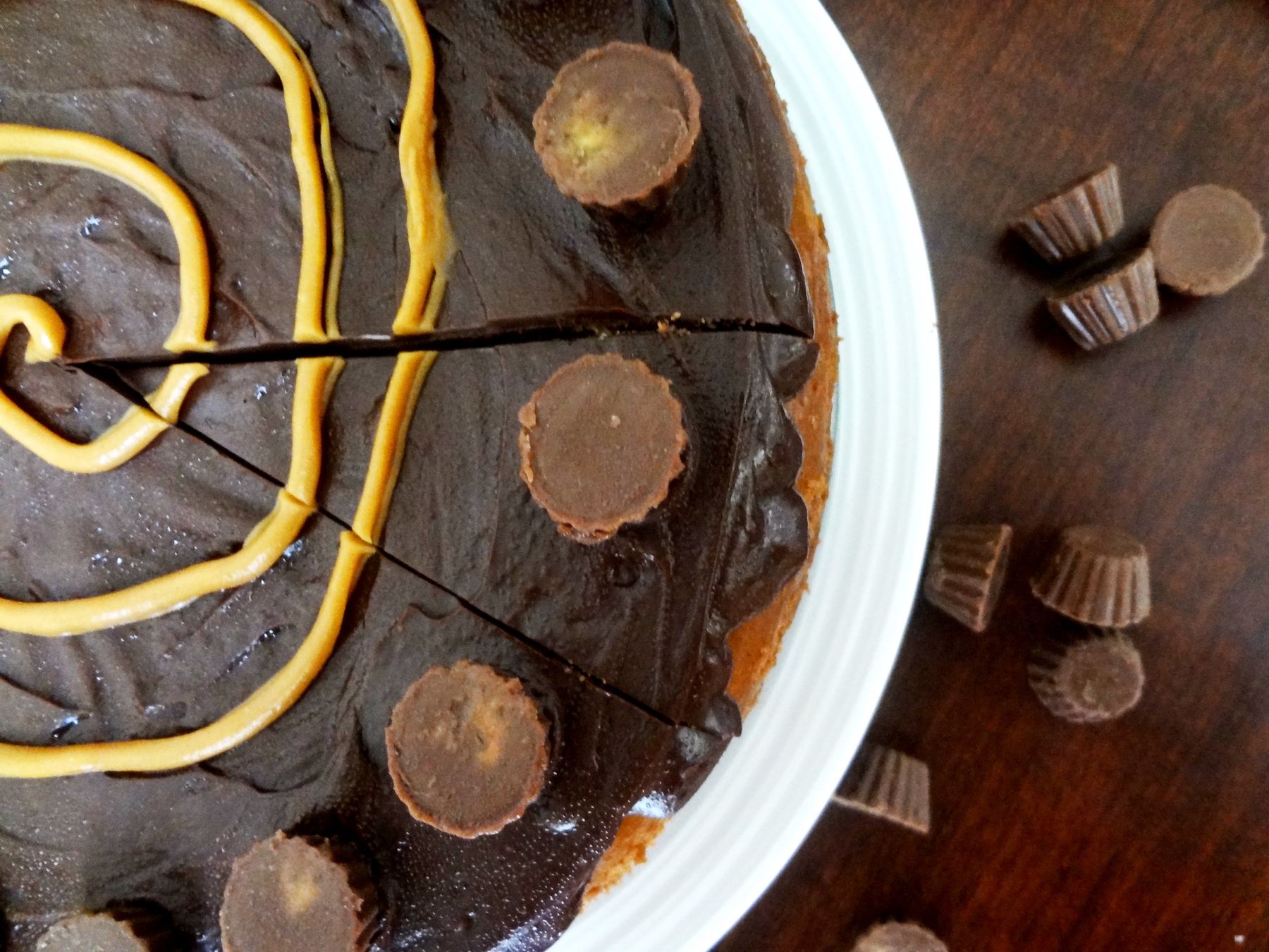 Chunks of Reese's peanut butter cups in the creamy peanut butter cheesecake with a thick layer of delicious dark chocolate ganache and peanut butter drizzle on top.