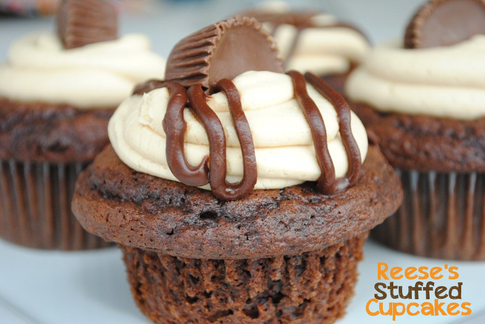 Chocolate cupcakes with a Reese's Peanut Butter Cup baked right inside, topped with peanut butter frosting, drizzled with chocolate and maybe throw another Reese's on top for good measure?