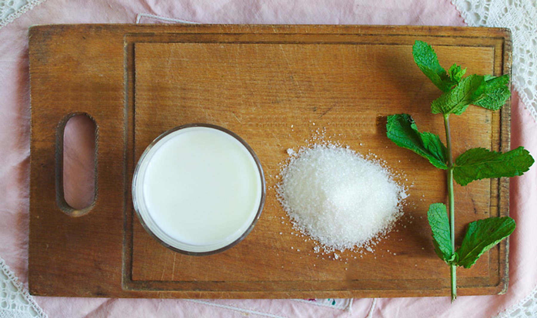 1. Pour milk into a saucepan, rinse mint and lightly rub it with fingers, so it gives the specific mint aroma. Put mint in a saucepan with milk and set on fire.