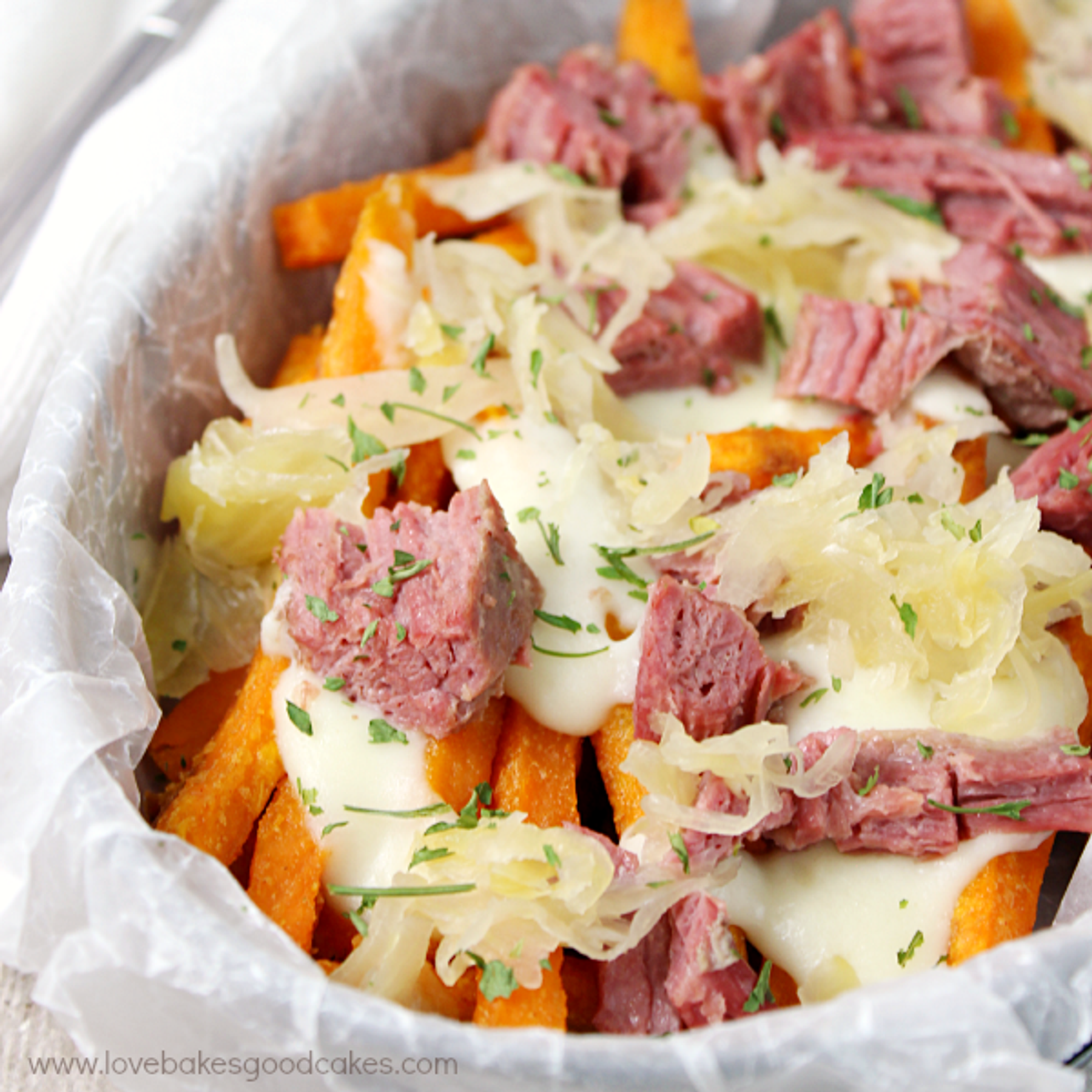 Sweet potato fries topped with plenty of freshly chopped corned beef, melty Swiss Cheese sauce and tangy sauerkraut! Serve it with a Russian Dressing for a meal that will make your taste buds say "wow!" Typically, you enjoy the sandwich with a side of fries - why not combine the two for a tongue-teasing easy main dish?!