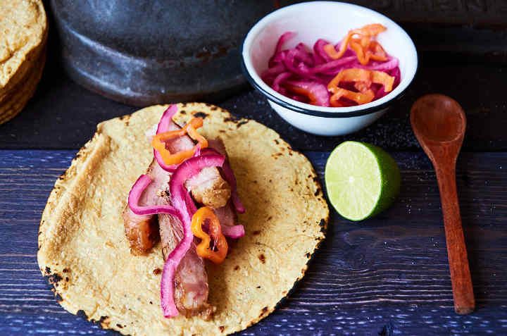 Ribeye steak tacos paired with a fruity, spicy red onion habanero salsa served with warm fresh corn tortillas.