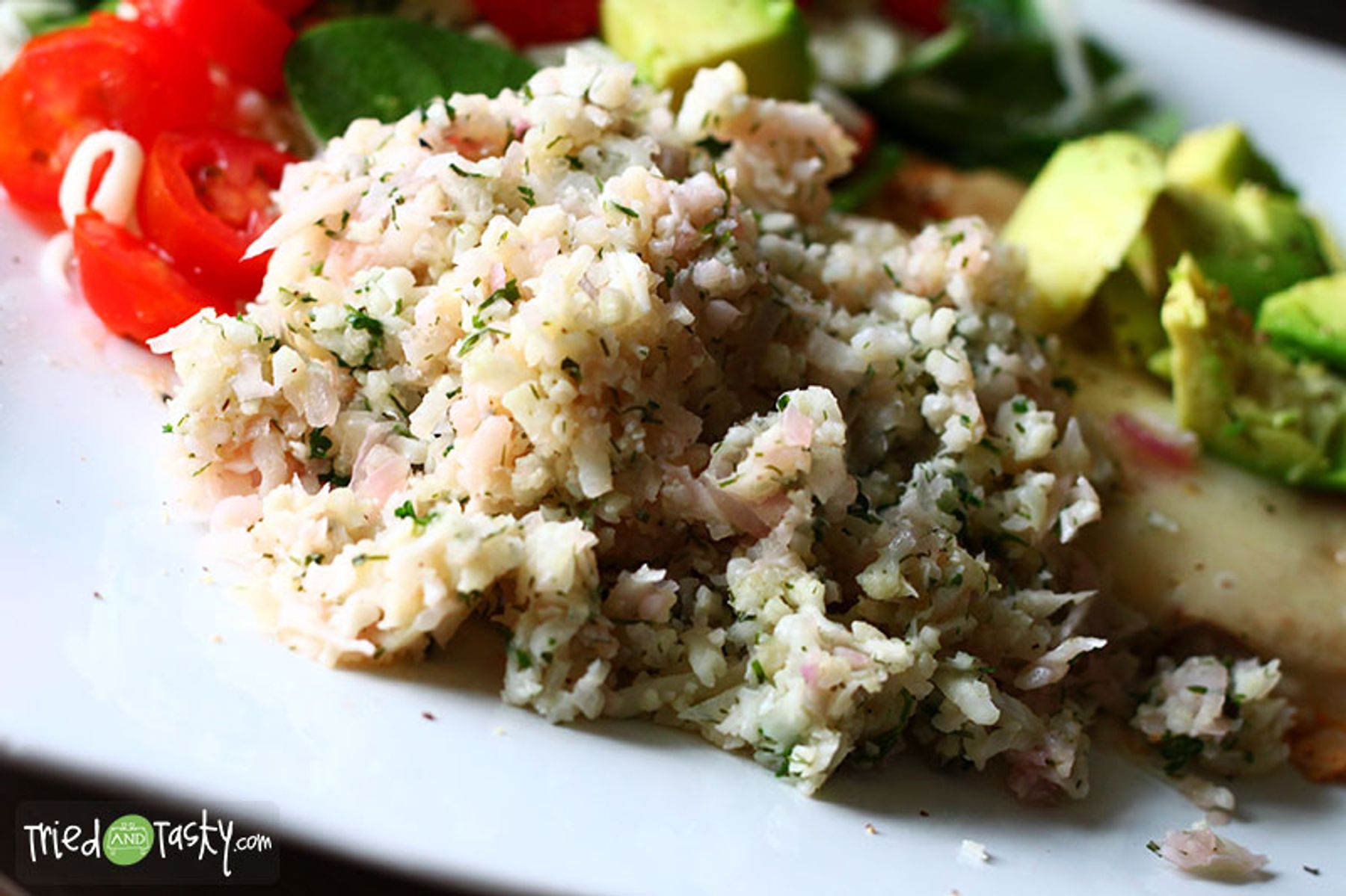 Heat olive oil in a large frying pan on med/high heat. Saute onions until translucent. Turn to medium heat and add cauliflower (add several pats of butter, if desired). Mix in herbs, salt, and pepper. Saute 10-20 minutes until cauliflower is the right texture; stirring often. It is important not to overcook the ‘rice’ (under-cook rather than overcook, otherwise it will become mushy). Remove from pan and squeeze 1/2 – 1 lemon over top. Stir. Serve.