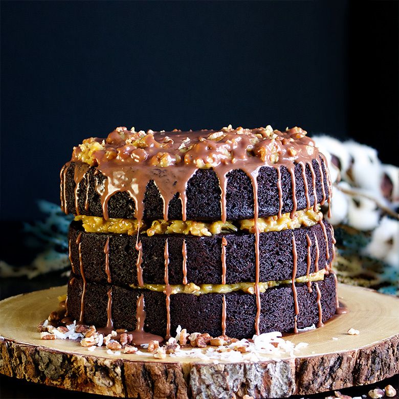 Rich German Chocolate Cake with caramel, pecan, and coconut filling and milk chocolate ganache