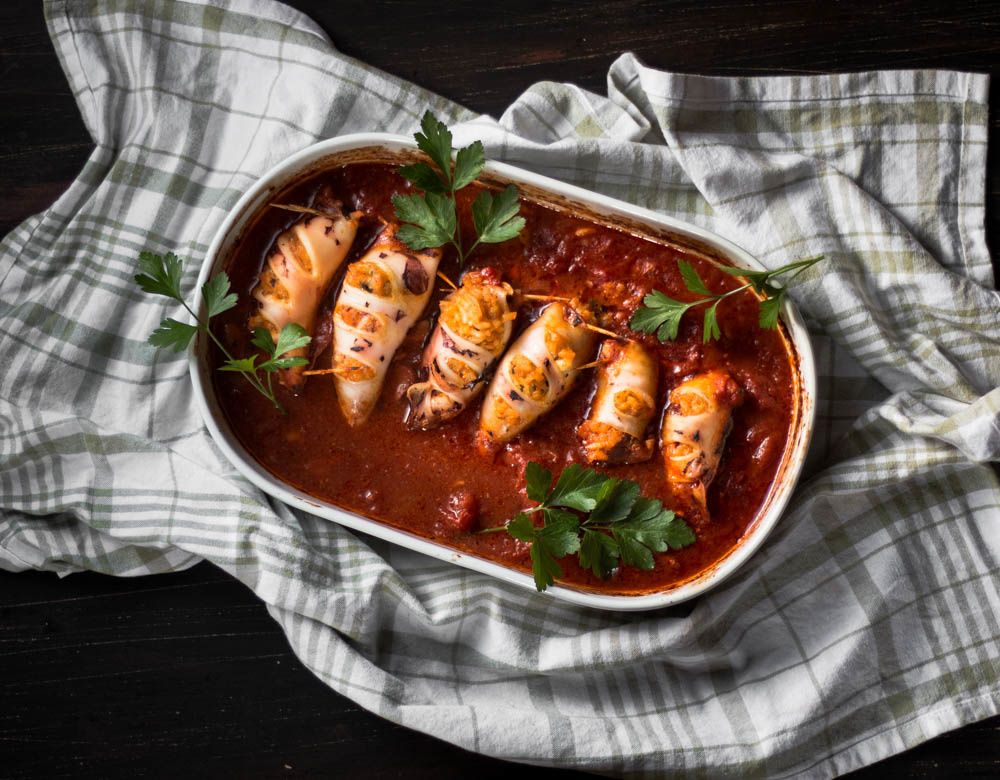 Risotto Stuffed Squid with Tomato Sauce