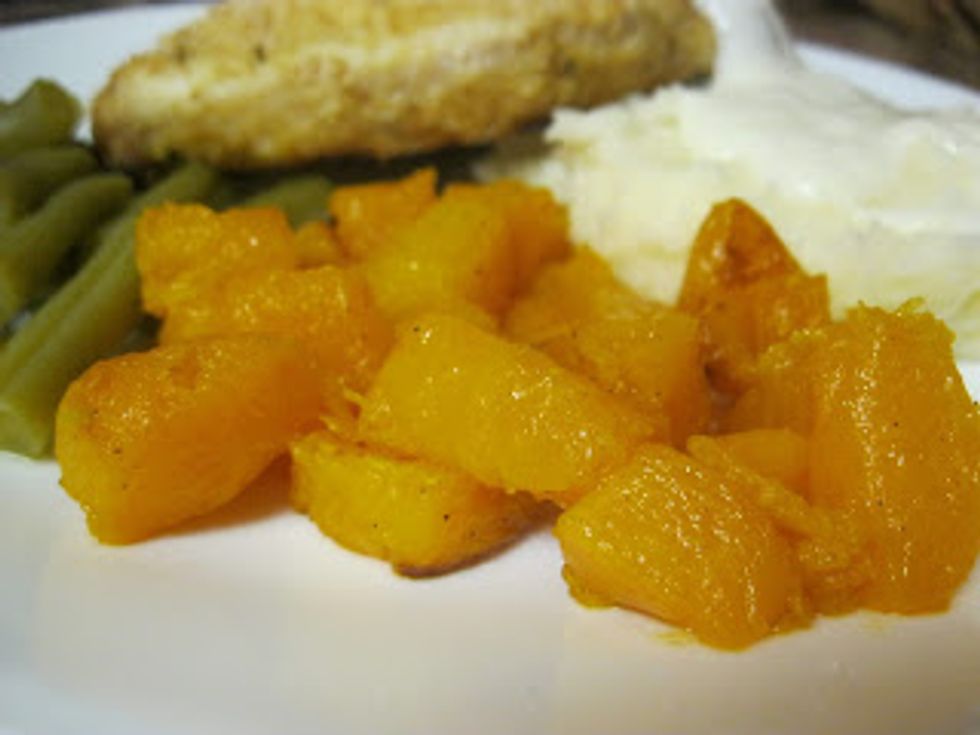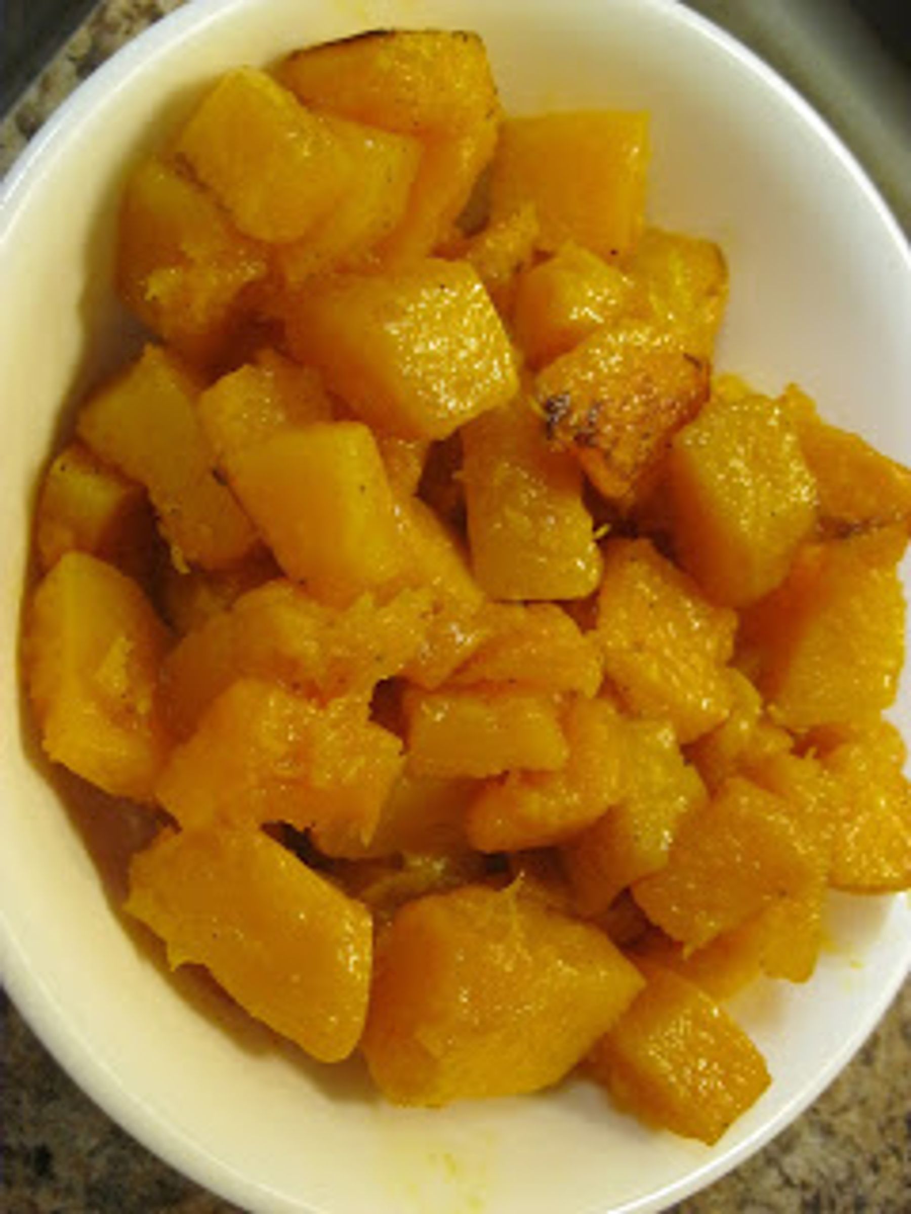 Cut, seed, peel, and chop the squash into 1 inch cubes.