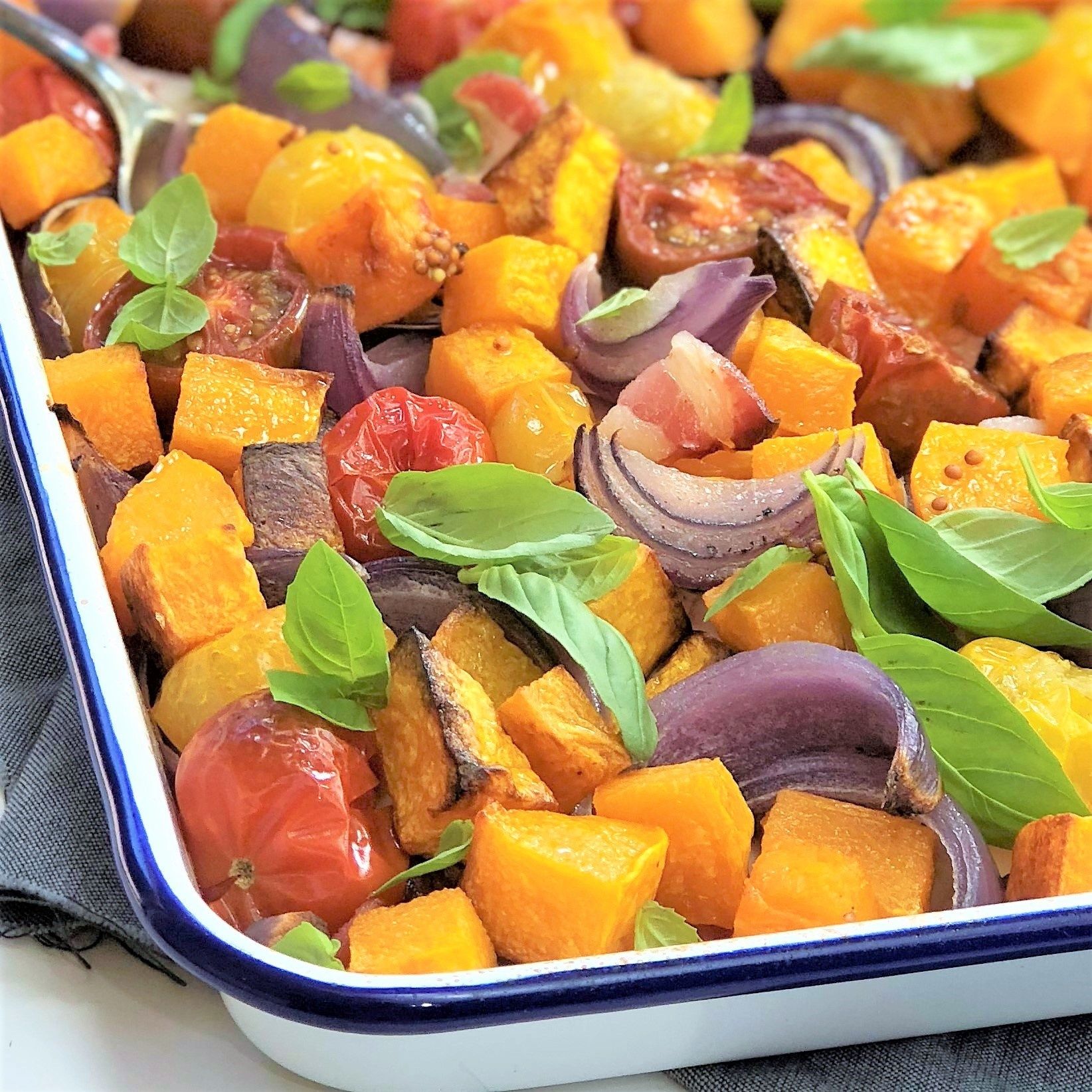 Roast Pumpkin Bacon and Tomato - one pan roasted vegetable side dish of pumpkin, bacon, tomatoes & basil served with a mustard dressing