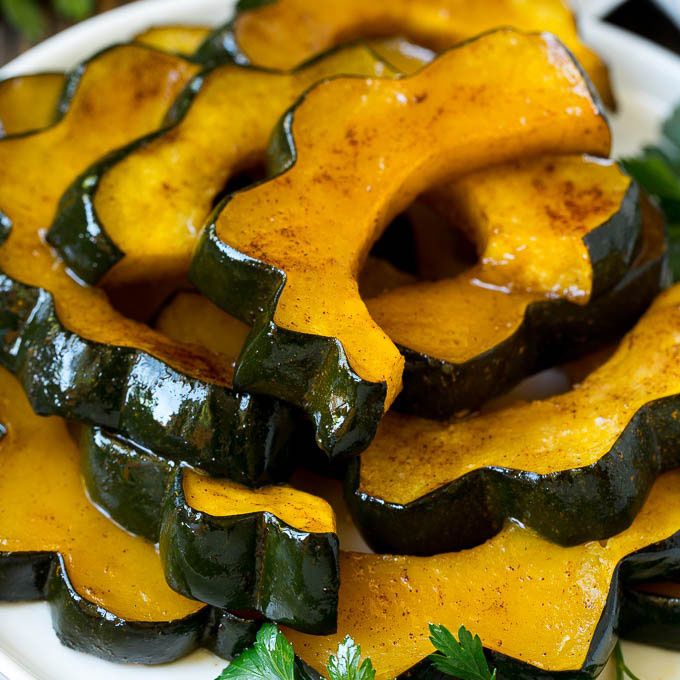 This roasted acorn squash is cooked with brown sugar, maple syrup and cinnamon for a sweet and savory side that's perfect for fall and winter meals. It pairs perfectly with a variety of proteins such as salmon, chicken, pork chops and steak.