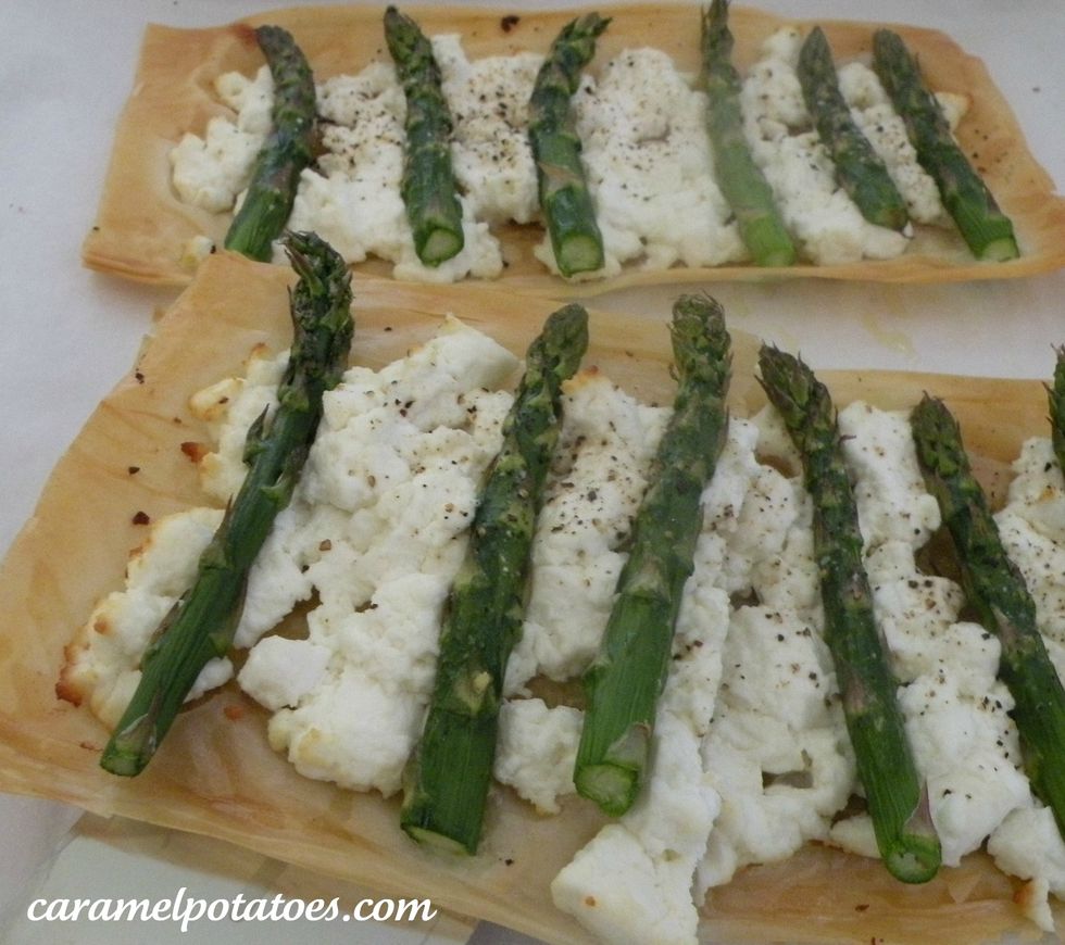 Brush the sheets of phyllo pastry with olive oil and fold each into a rectangle. Place on a baking sheet. Crumble the goat cheese on top, leaving a border of pastry. Add the asparagus. Drizzle with olive oil and season with salt and pepper. Bake for 12-15 minutes, until the pastry is golden-crisp and the asparagus just tender.
