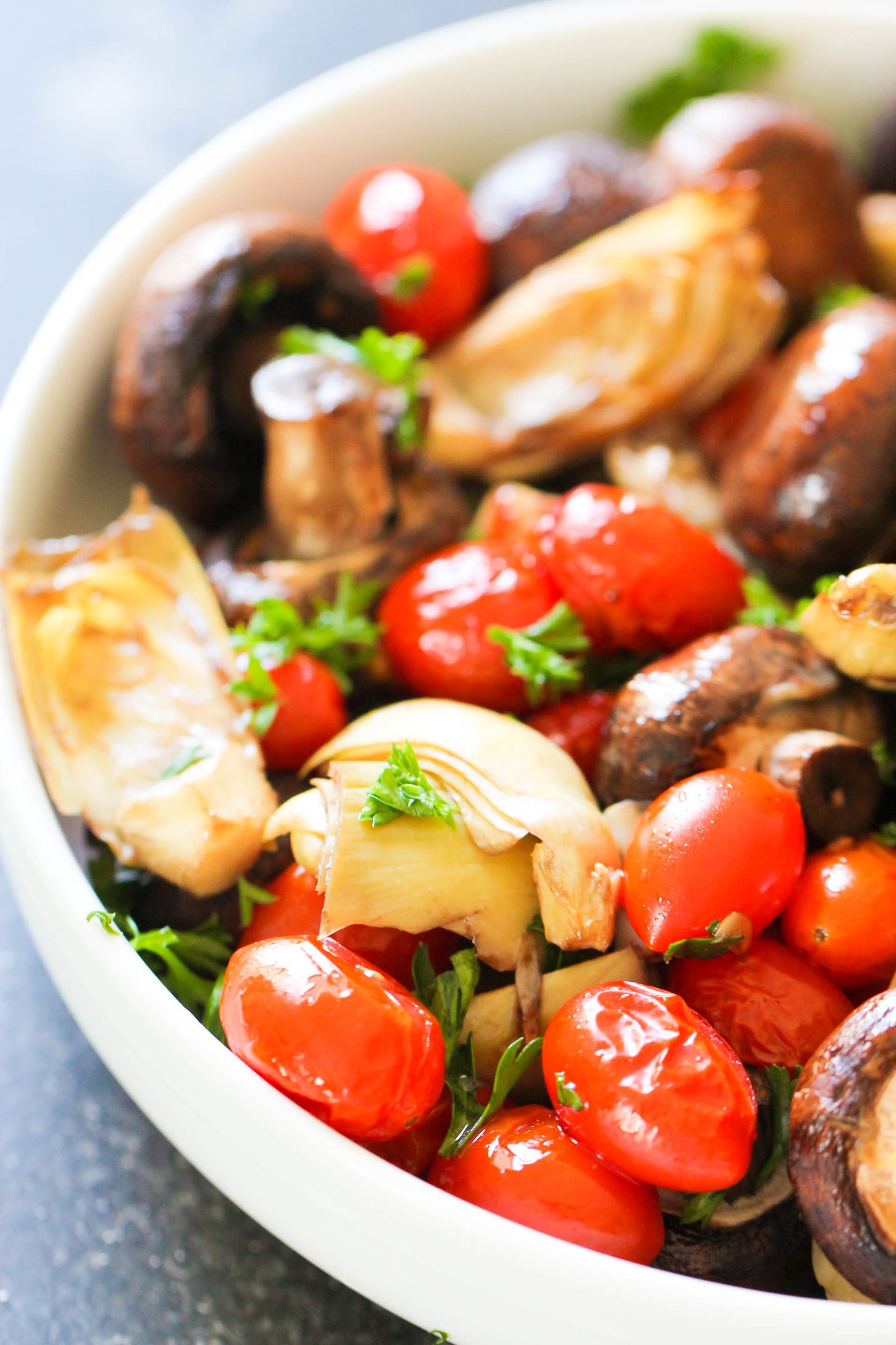 In a large bowl, mix together mushrooms, tomatoes, artichokes, balsamic vinegar, and olive oil. Spread out evenly on a foiled-lined baking sheet.