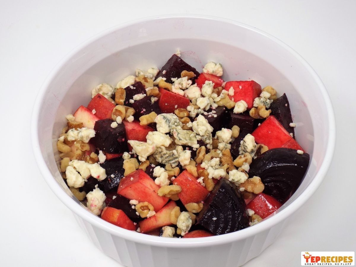 Roasted beets and apples tossed in olive oil, salt, and pepper then topped with walnuts and blue cheese.