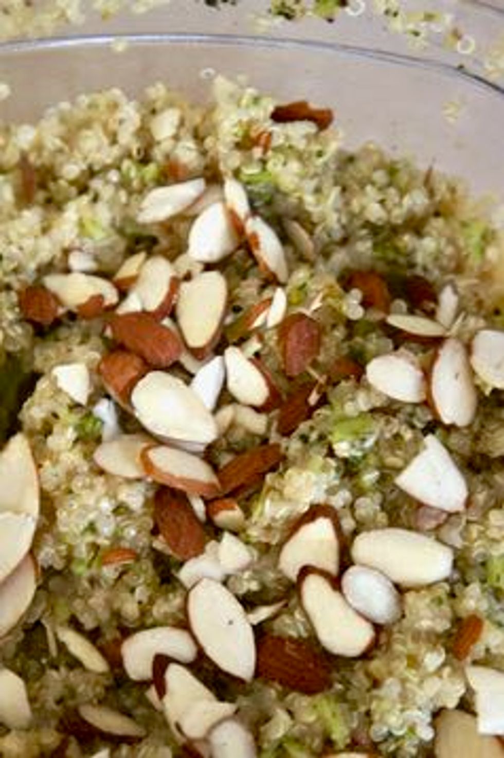 The combination of roasted broccoli with quinoa, a homemade honey mustard dressing and sliced almonds for added crunch makes a delicious side dish.