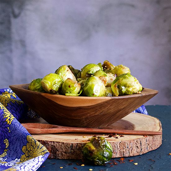 Crisp-tender roasted Brussels Sprouts simply dressed with olive oil, crushed red pepper, and garlic.