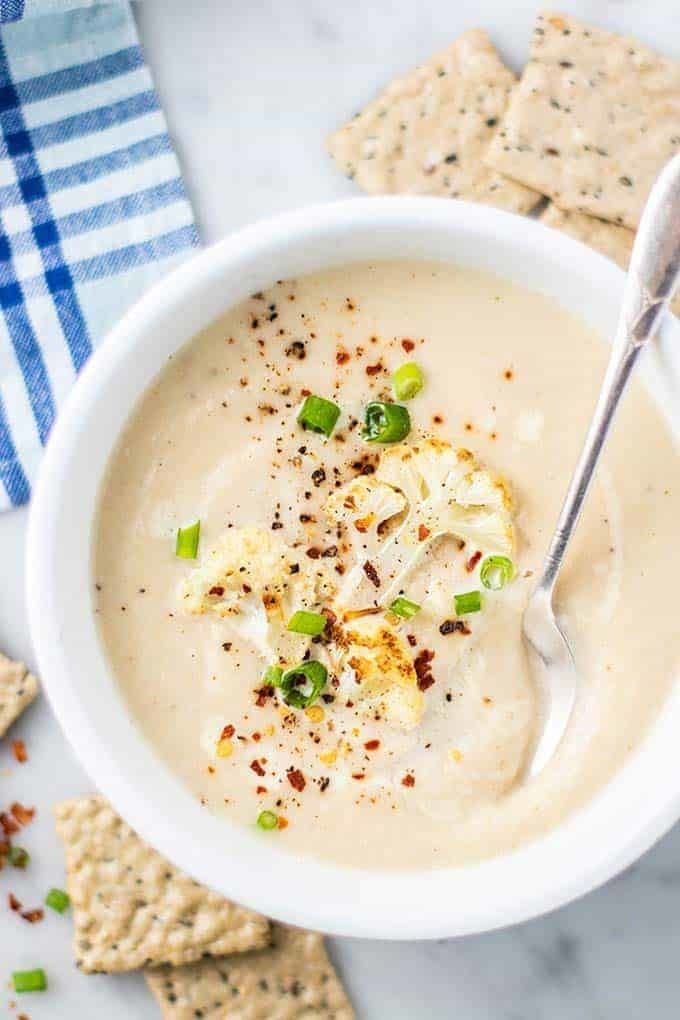 A dreamy and luxurious Roasted Cauliflower Soup, made by roasting cauliflower and garlic for a deep, sweet base. This healthy cauliflower soup recipe is kept dairy free with an easy cashew base.