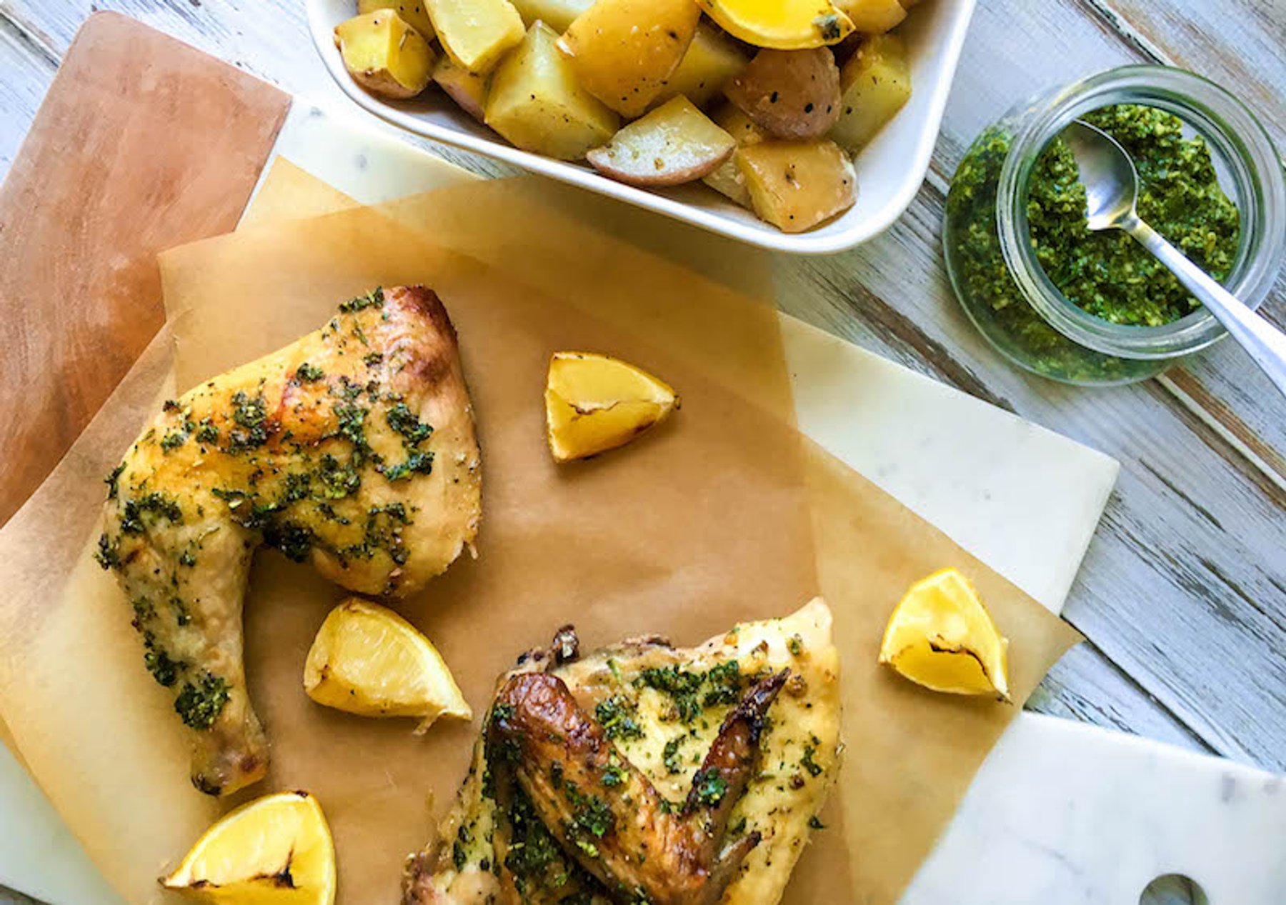 ROASTED CHICKEN AND POTATOES WITH HERB SAUCE
