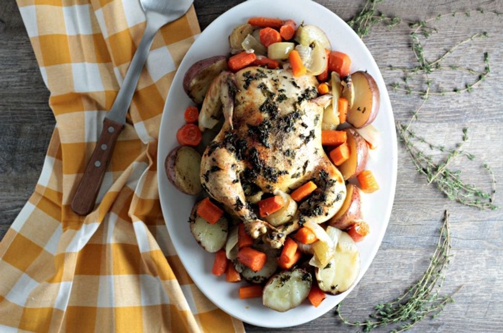 Roasted Chicken, Potatoes, & Carrots: Whole chicken, red potatoes, carrots, onion, olive oil, thyme, and parsley is all you need to make this meal in a pan!