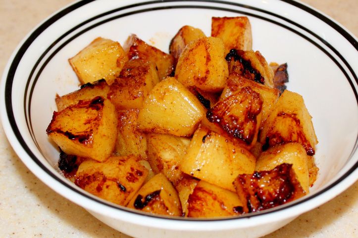 Pineapple tossed with cinnamon and roasted in olive oil – so delicious!