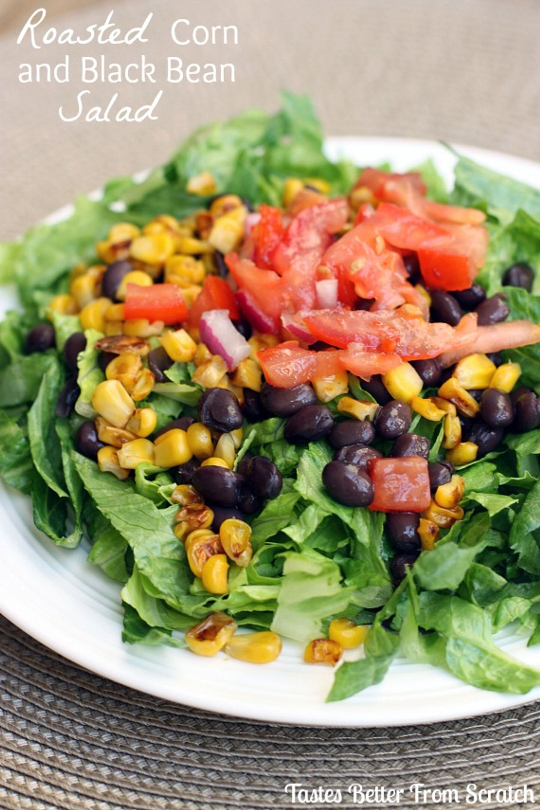 Fresh greens topped with roasted corn, black beans, and a tomato/onion marinade.