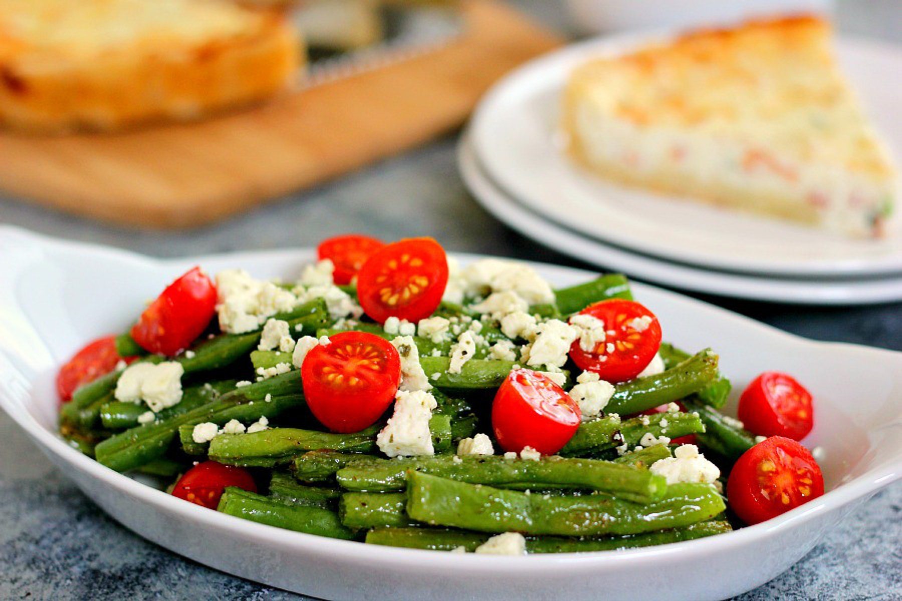 This Roasted Garlic Green Bean Salad is filled with fresh beans, ripe tomatoes and feta cheese, combined with a light garlic and lemon dressing!