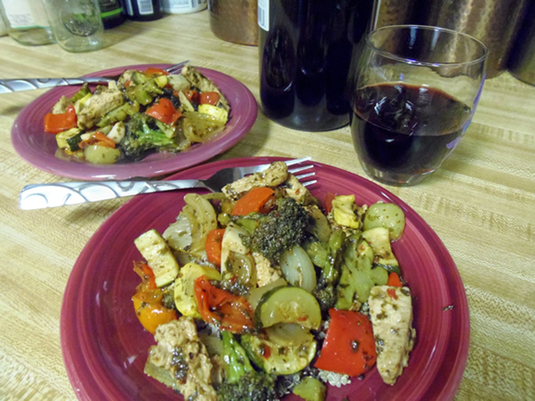 Preheat oven to 450F. In a small bowl whisk marinade ingredients. Cut up the veggies and slice each piece of chick\\\'n into bite sized pieces. Place in a large bowl. Pour the marinade over the...