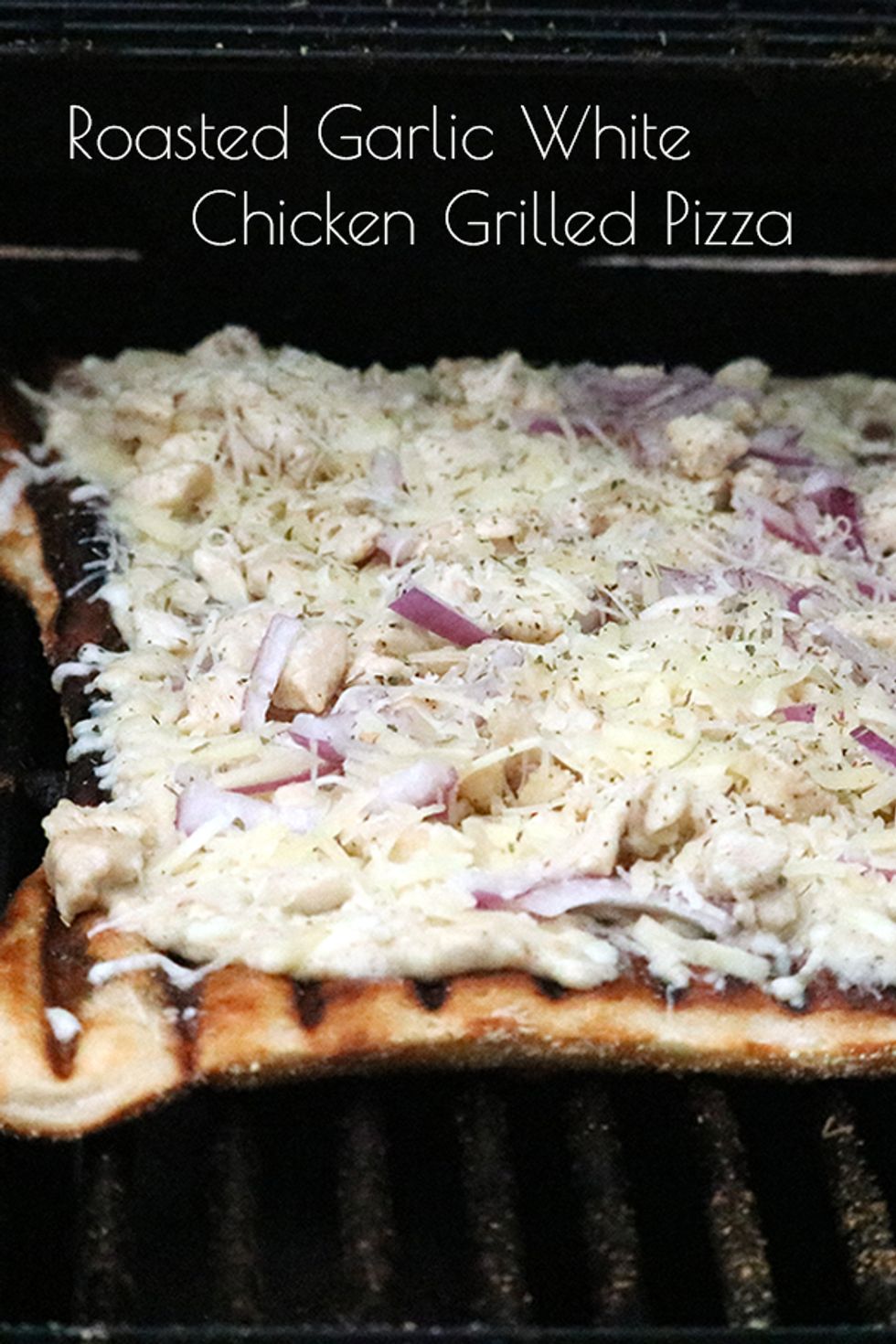 Roasted Garlic White Chicken Grilled Pizza – a super easy, wonderfully flavorful white sauce topped with chicken and onions and grilled to pizza perfection; an amazing summer meal!