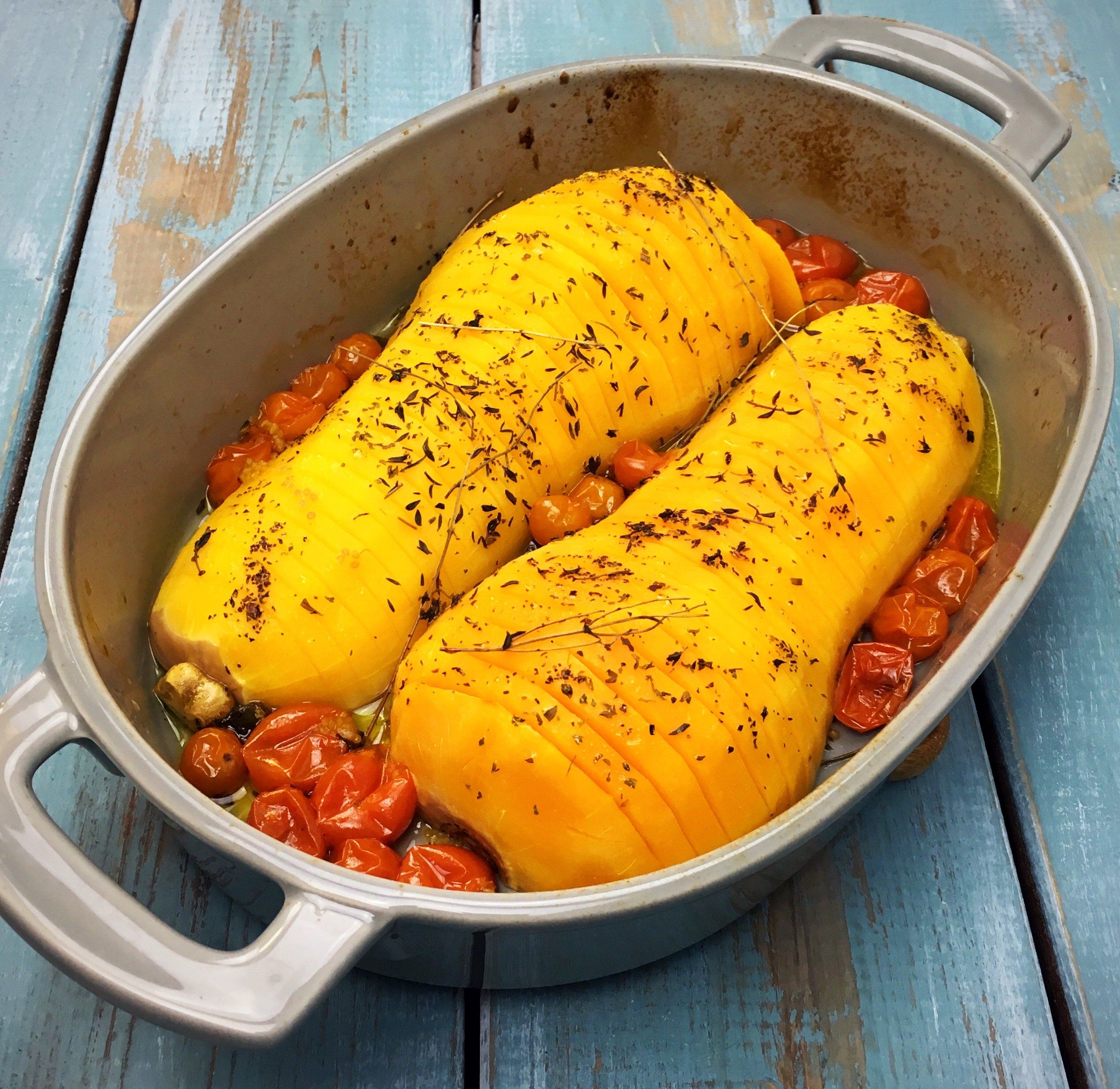 ROASTED HASSELBACK BUTTERNUT SQUASH WITH CHERRY TOMATOES