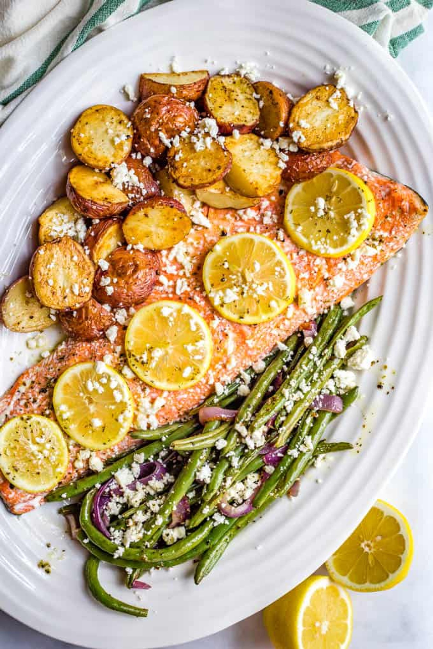 One-pan salmon and potatoes with green beans is an easy sheet pan dinner that's topped with feta cheese and a lemony vinaigrette.