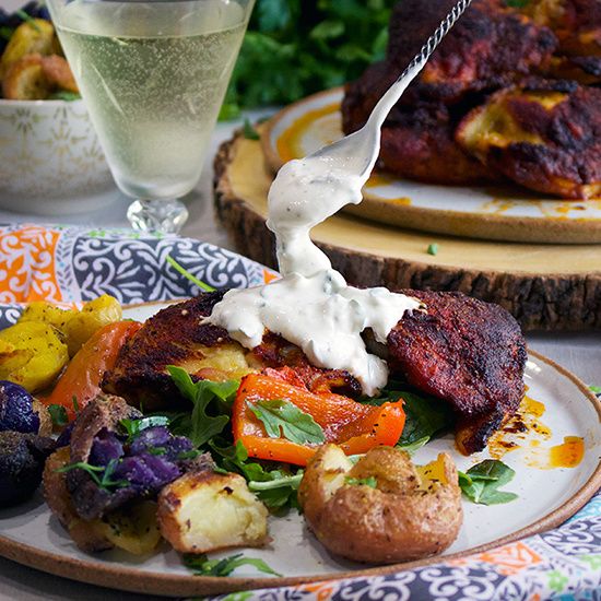 Roasted Paprika Chicken is juicy, packed with flavor, and could not be easier. Simply coat the chicken with a paprika rub and throw it in the oven or on the grill. Herbed yogurt sauce takes less than 5 minutes to make and provides a delicious contrast of flavors and textures. Serve with roasted red bell peppers and arugula coated in a light vinaigrette, with a few smashed potatoes if you like.