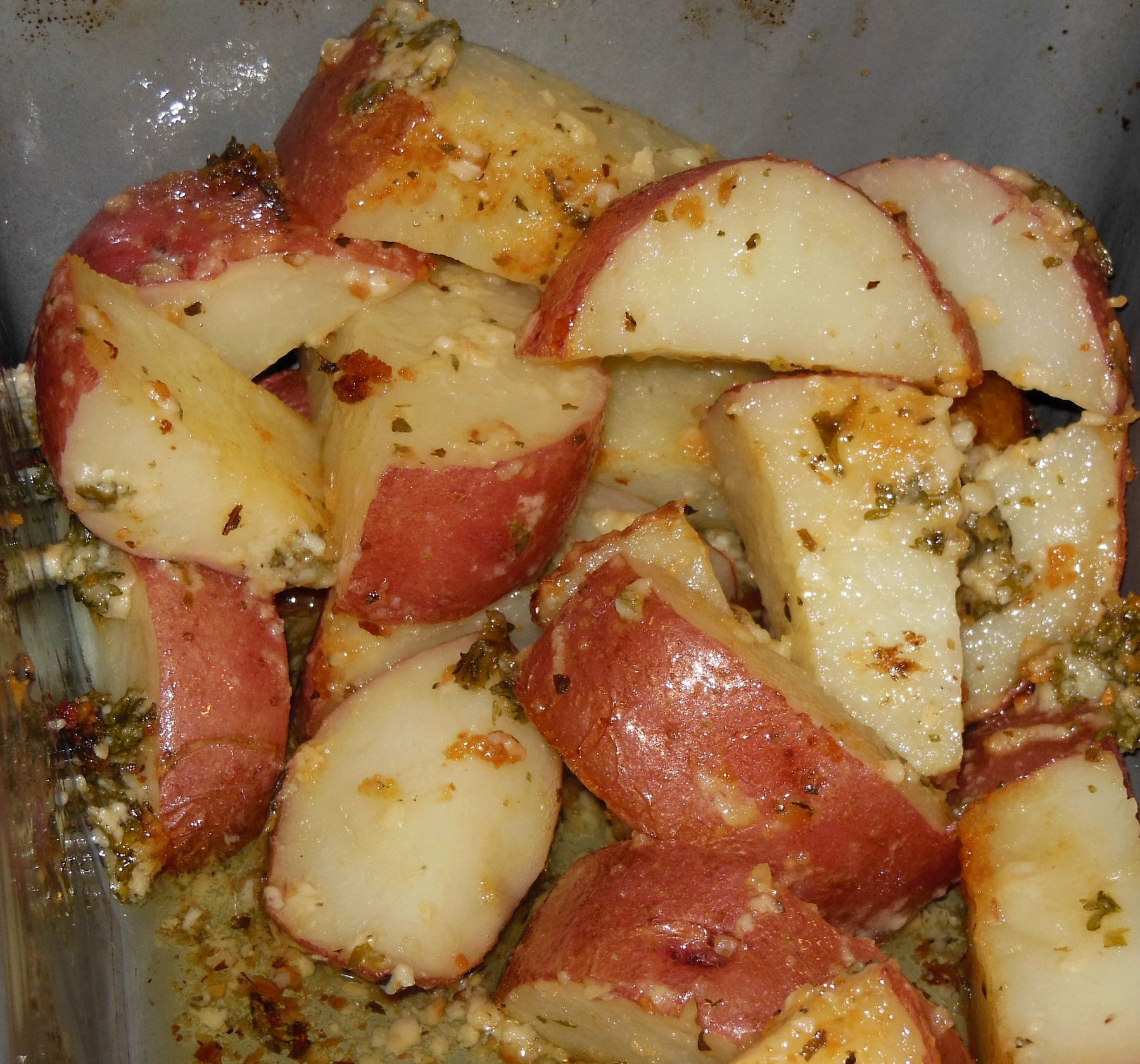 This could not be easier!! Cut the red potatoes into chunks. In a separate bowl, mix the remaining ingredients. Mix in the potatoes until evenly covered.