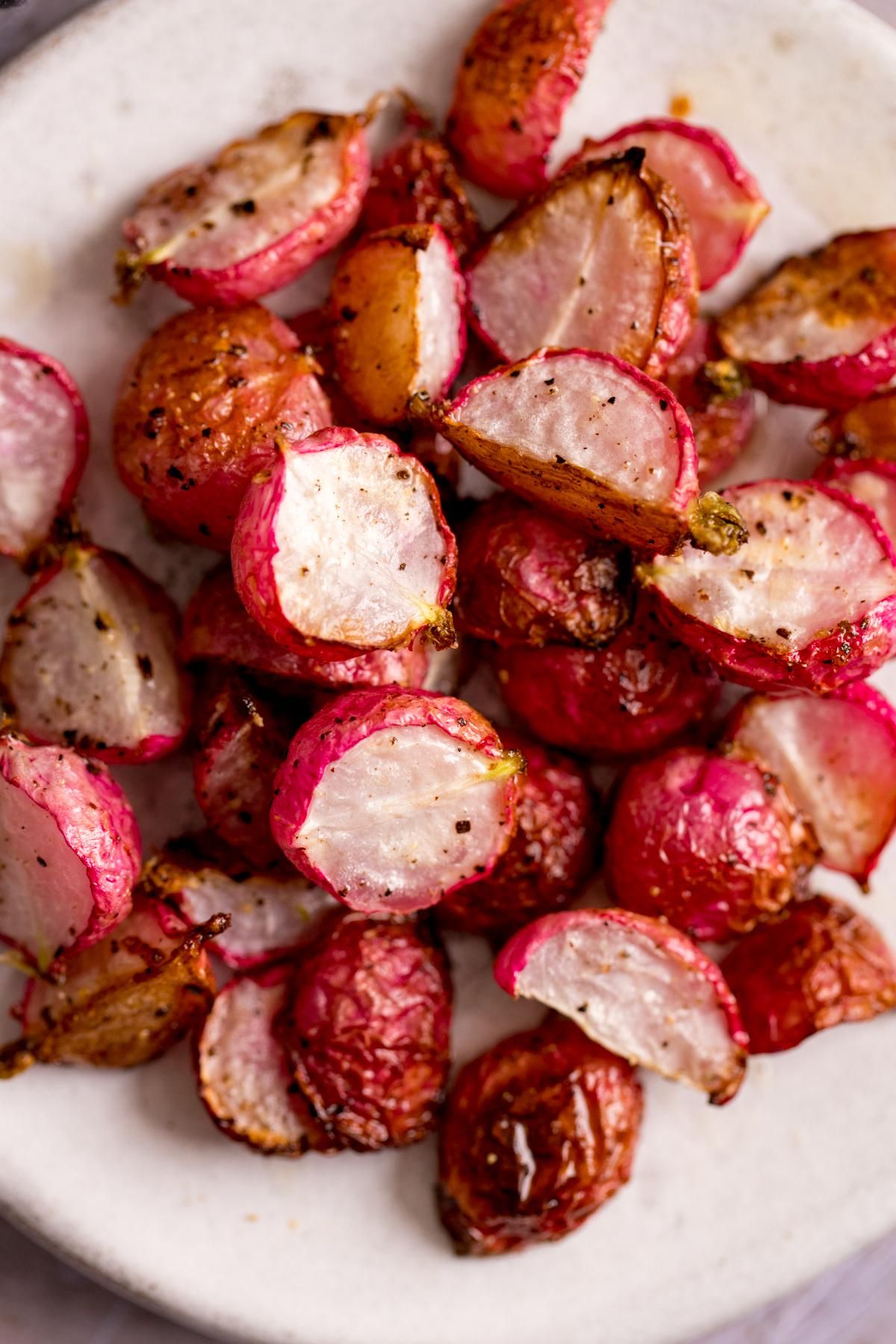 Simple roasted radishes make a great, lighter alternative to potatoes. Easy to prep and bake (no peeling or par-boiling). A tasty low-carb side dish