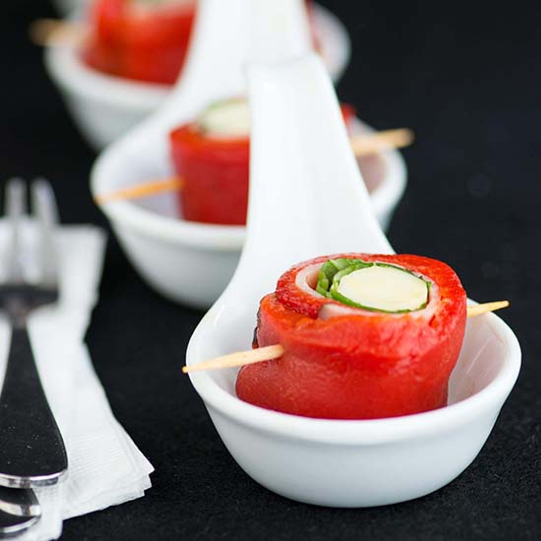 Roasted Red Pepper Involtini – an easy, elegant, no cook appetizer. Great for antipasto platters. Low calorie and protein packed.