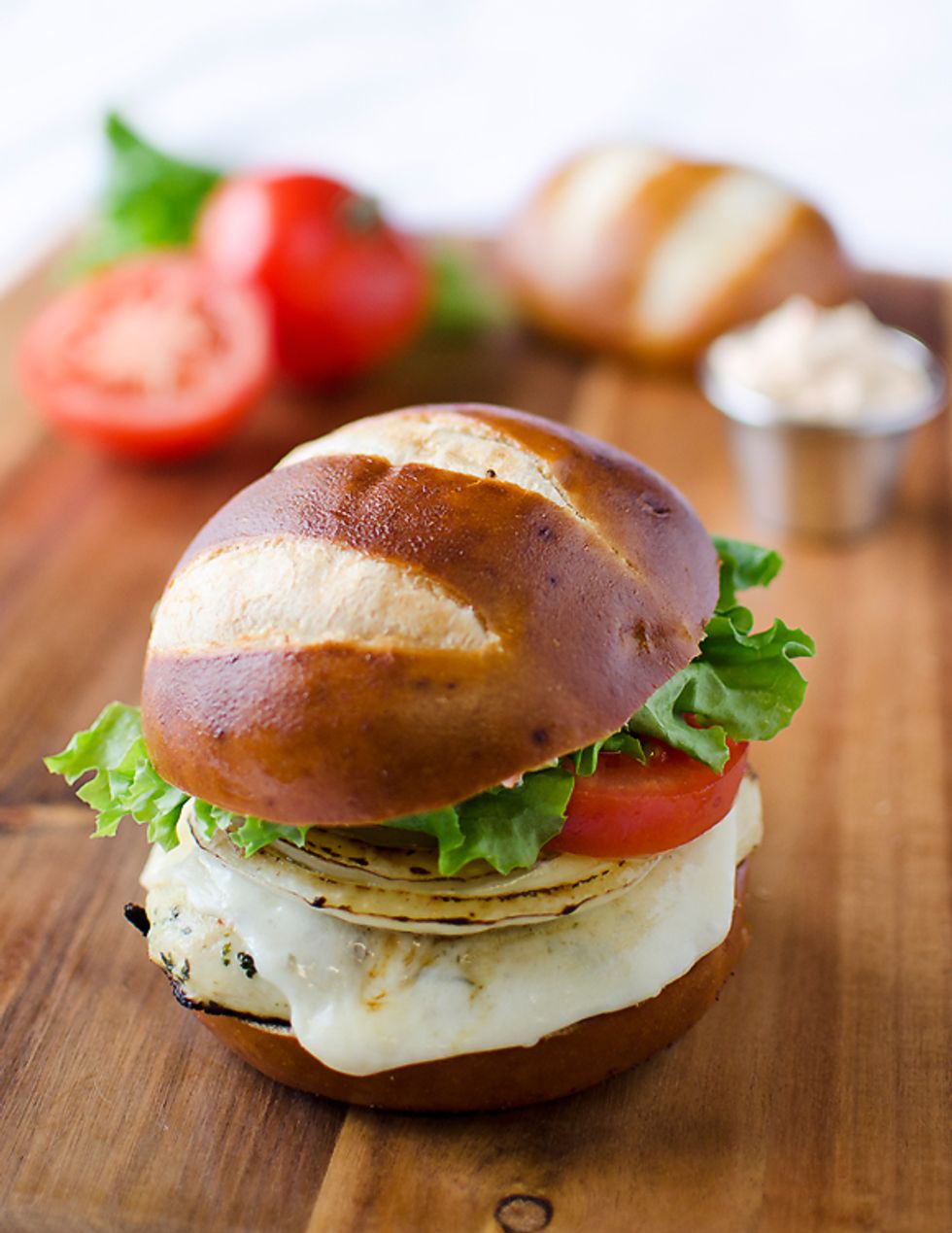 This sandwich is a great combination of creamy roasted red pepper spread, melted provolone cheese, tomatoes, grilled onions and chicken all atop a moist, chewy pretzel bun.