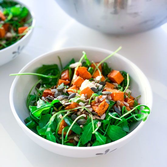 A simple, healthy & filling salad with roasted sweet potatoes, feta cheese and arugula - all topped with a delicious lemon-tahini dressing.
