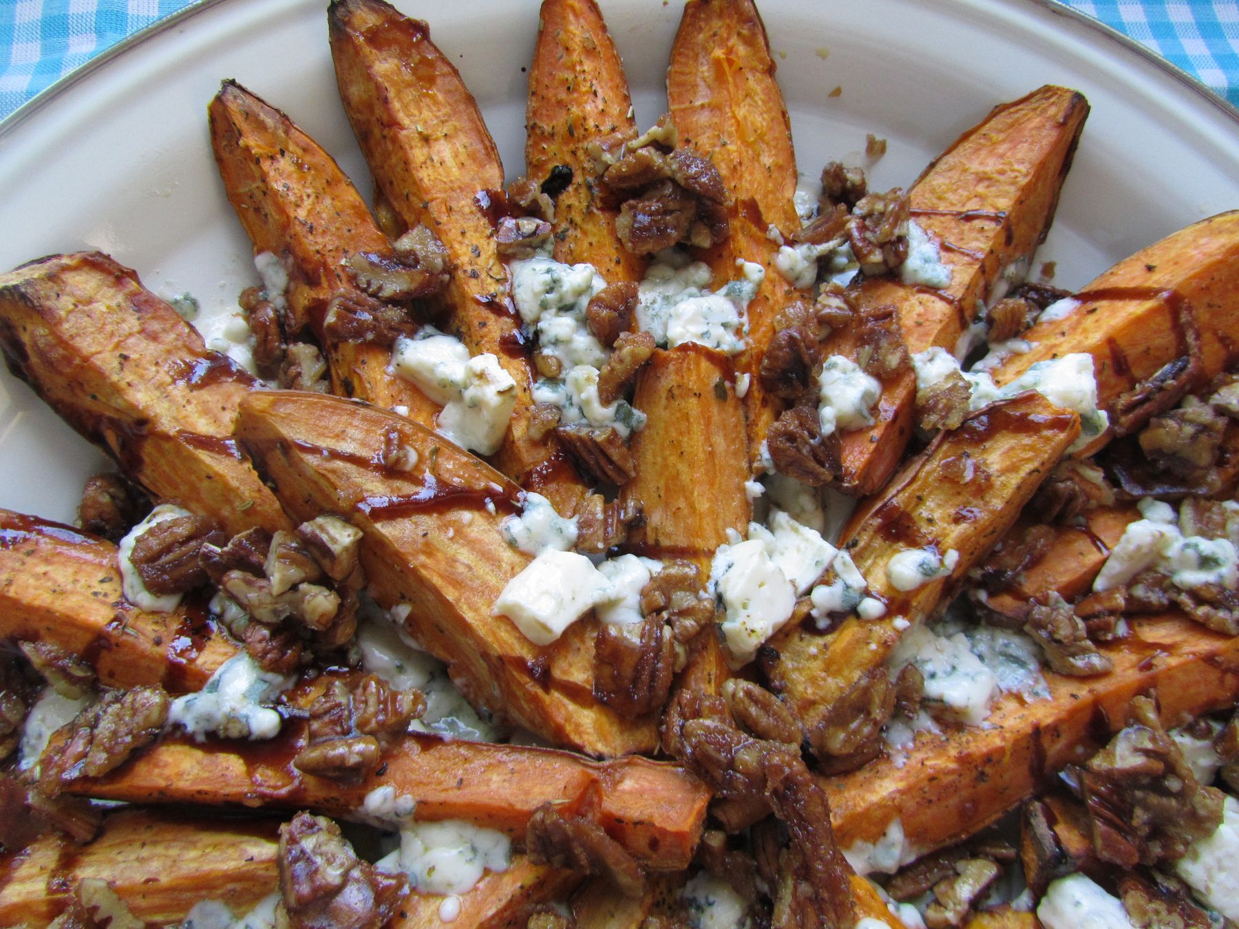 Roasted Sweet Potatoes with Blue Cheese & Spicy Candied Pecans