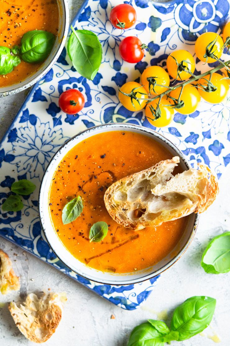 A rich and creamy Roasted Tomato Soup made with fresh cherry tomatoes, caramelised shallots, fresh thyme and basil. This soup is super easy to make and is both comforting and healthy. Serve with slices crusty bread.