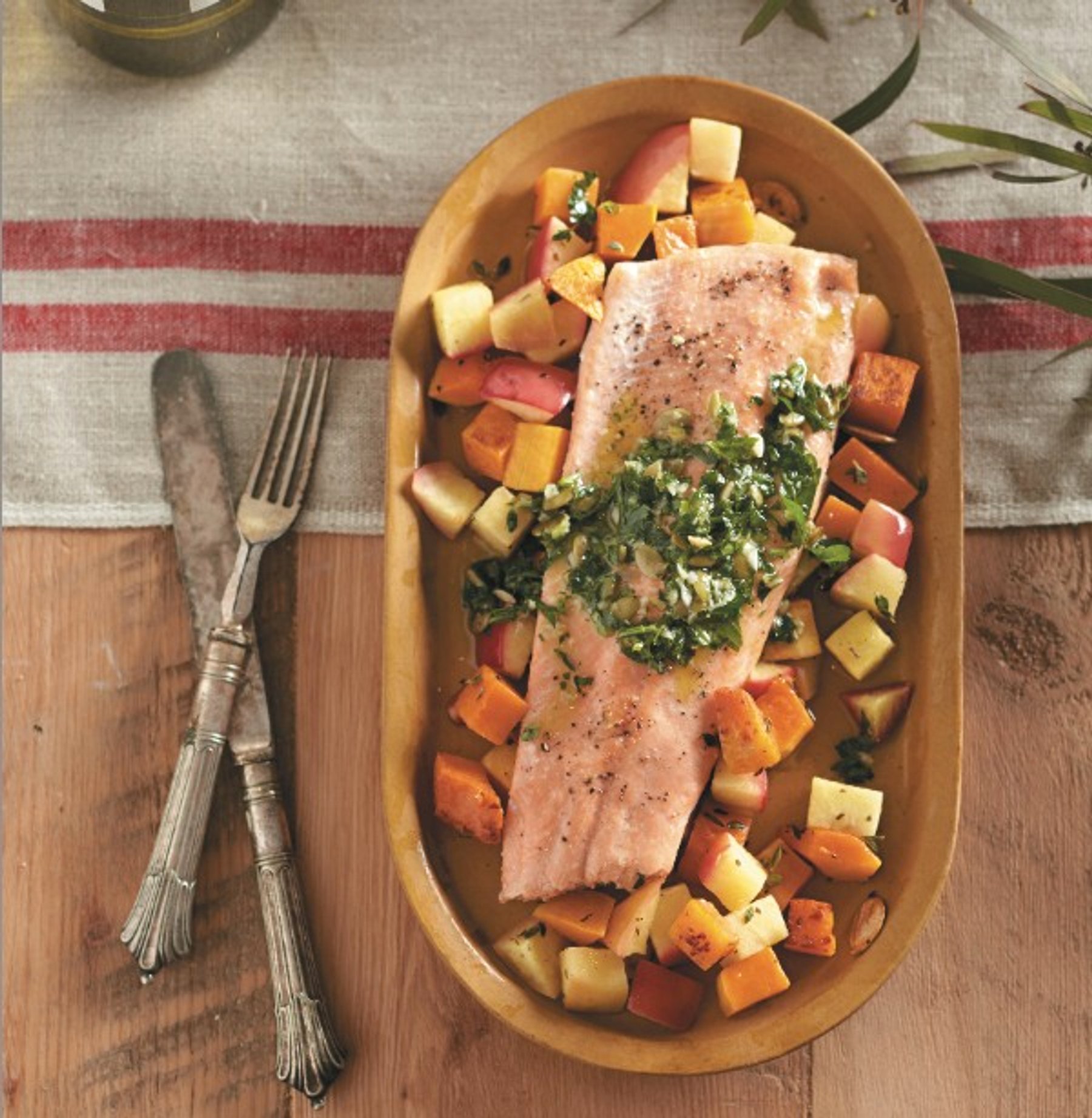 Surrounded by freshly chopped apples and squash, this roasted trout recipe captures the flavours of early fall perfectly. Drizzle with pepita pesto and set out to serve.